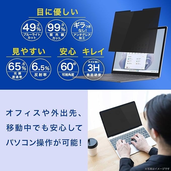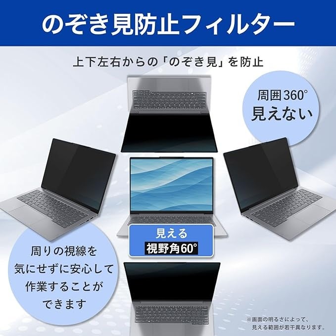 視野角 60度、正面から見れると画面はクリアでも、上下左右からは真っ暗に映る偏光性を有する「覗き見防止フィルター」です。