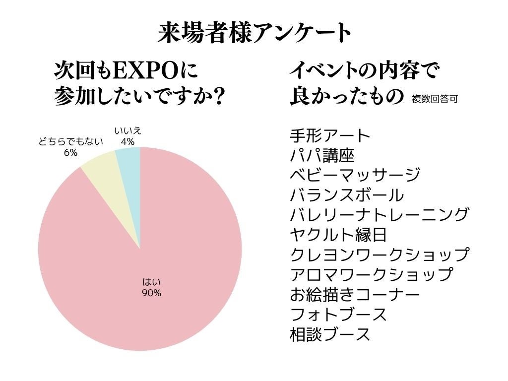 イベント終了後の来場者アンケートでは、「子供が楽しめるイベントなので嬉しい」「親も子も楽しめる内容で楽しかった」「無料でいろんな体験ができ、親子共に大満足だった」「素敵なイベントでした!お土産もいただいて嬉しかった」など好評の声が多くあり、今回も満足度は90%となりました。