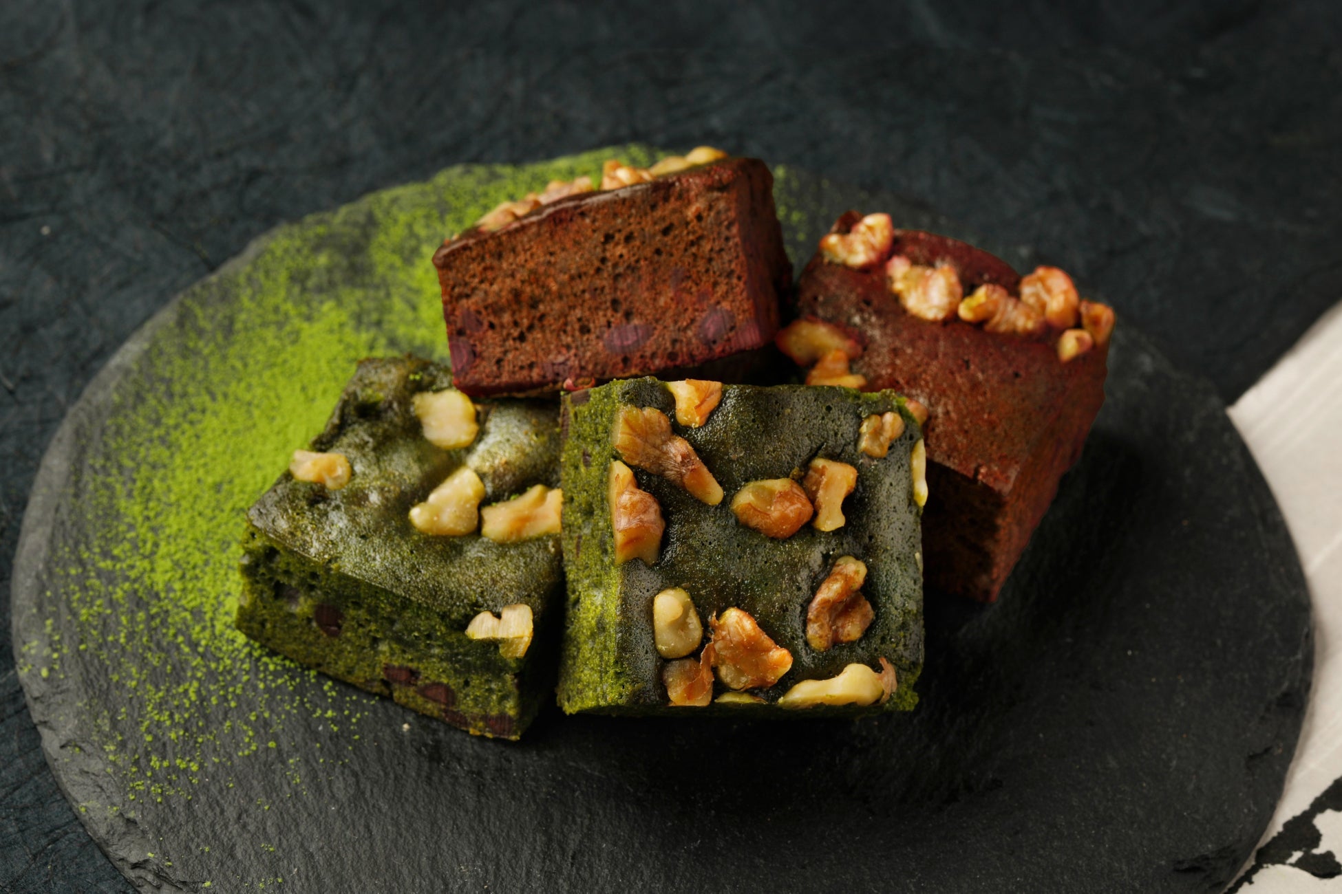チョコレートをたっぷりと使った、しっとり感が自慢の「麻布台ブラウニー」。定番のプレーンのブラウニーに加え、抹茶フェアに合わせて抹茶味のブラウニーが復活します。抹茶の味を出すためにホワイトチョコレートを使い、チョコチップでチョコレート感を、くるみで食感にアクセントをプラスしました。西尾抹茶の濃厚な味わいをお楽しみいただけます。