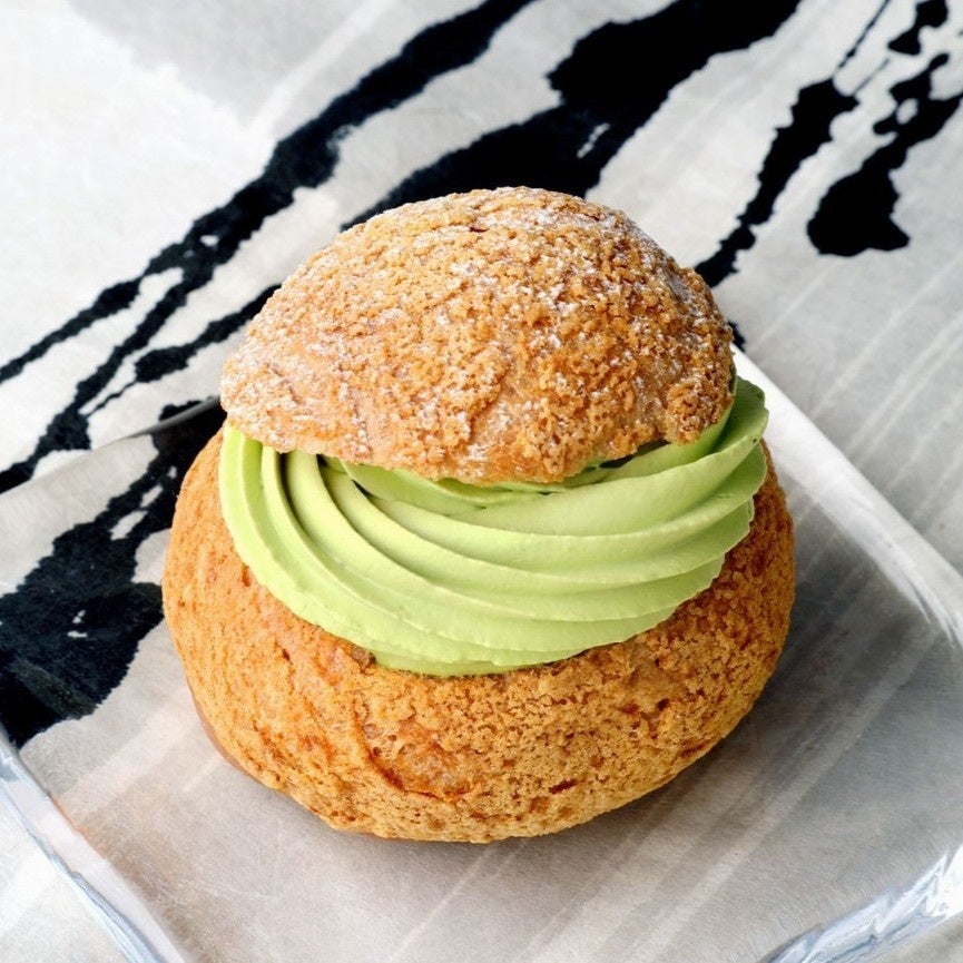 生クリームとカスタードクリームの両方に上質な西尾抹茶を使用したシュークリーム。一口食べれば、抹茶の香りが豊かに広がります。