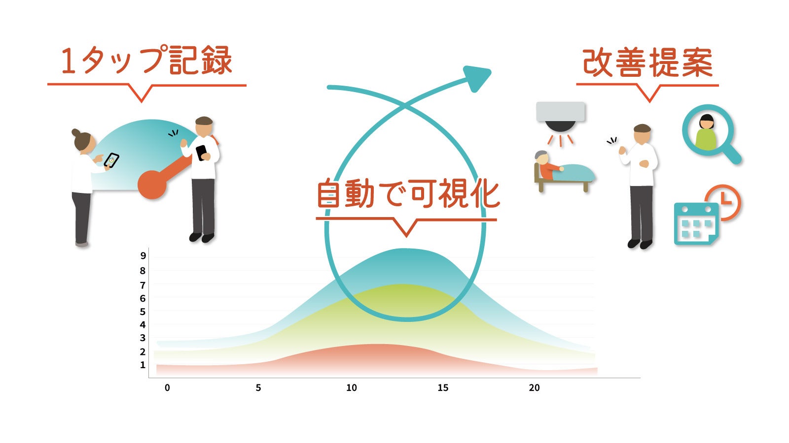 介護人材が不足し業務に追われている現場では、職員毎の役割分担が不明確であったり、どのICTを導入すべきか悩んでいたりする課題に対し、「ハカルト」は自動で改善提案を行い、利用者様と向き合う時間を増やすことを可能とします。