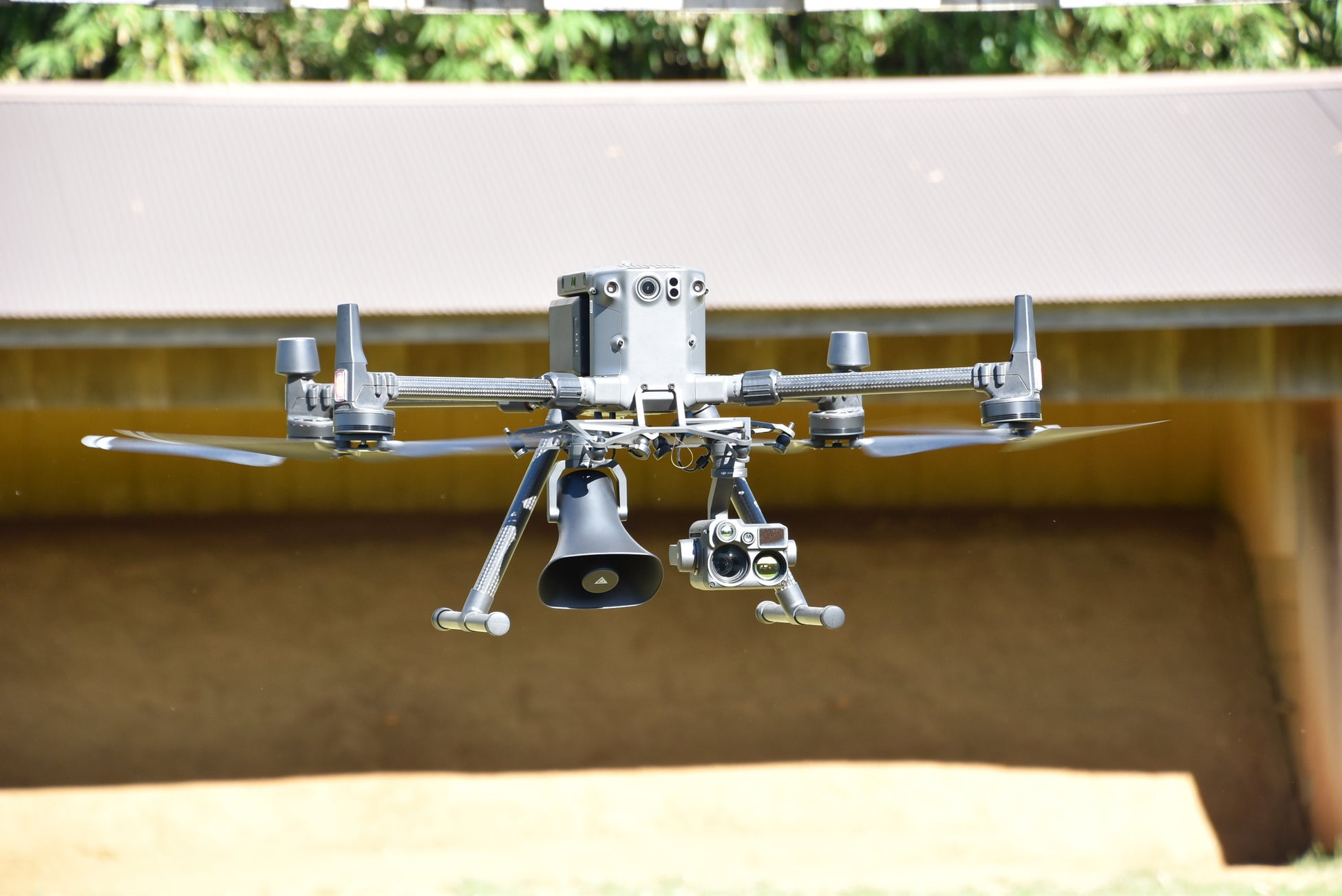 スピーカーを使い上空からの呼びかけ、夜間の暗視カメラによる地上誘導員への指示、ライトによる夜間の通行補助といった活用を全国でも先駆けて行っています。