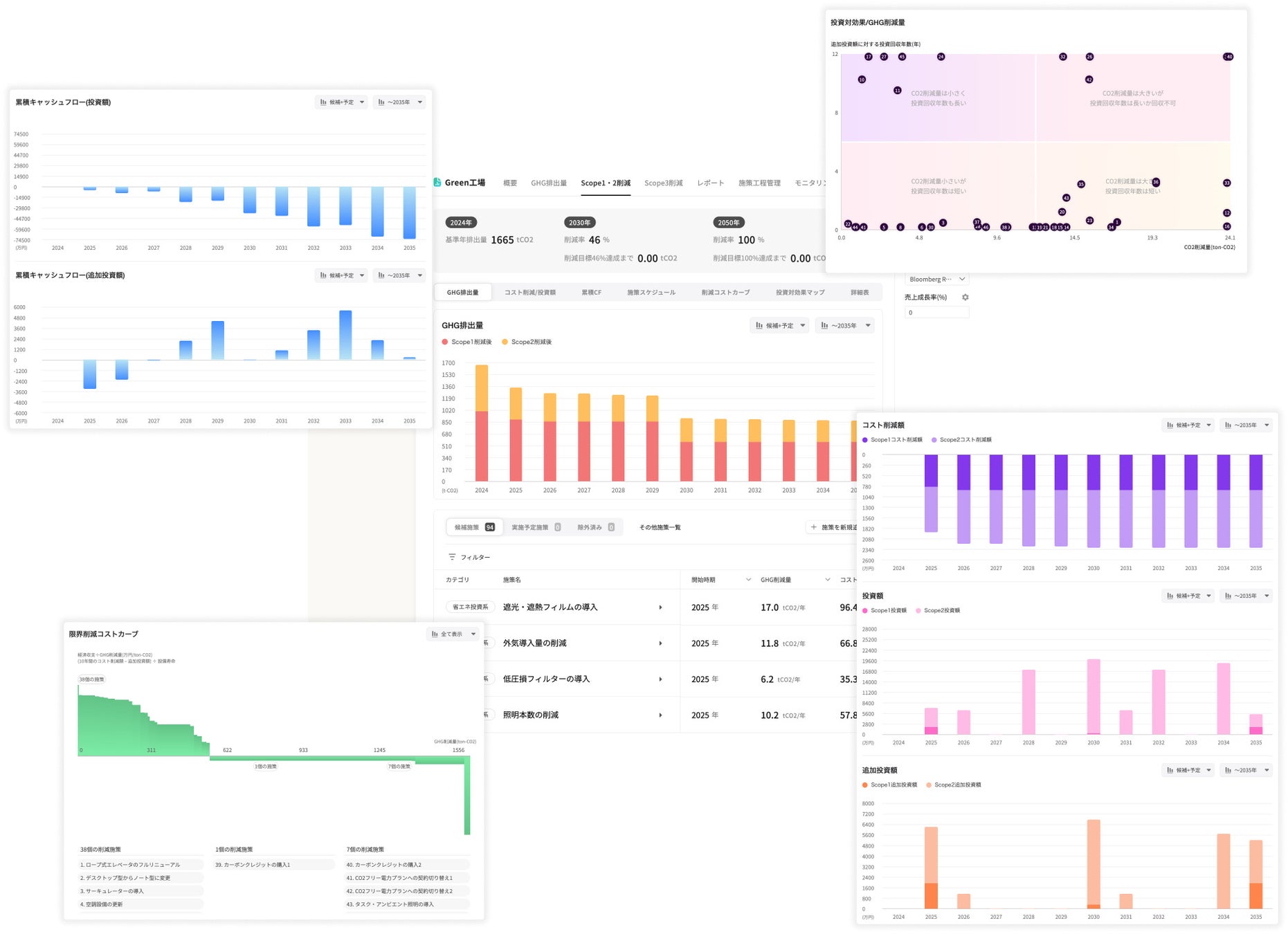 『Green AI』は、環境や設備に関する専門知識がなくても短時間で脱炭素ロードマップを作成できるシステムです。1500以上の脱炭素・省エネ施策を網羅したデータベースから、ユーザー情報に基づいて最も経済的な施策を自動で選定し、コスト削減と脱炭素を両立させる削減計画を自動で策定します。
