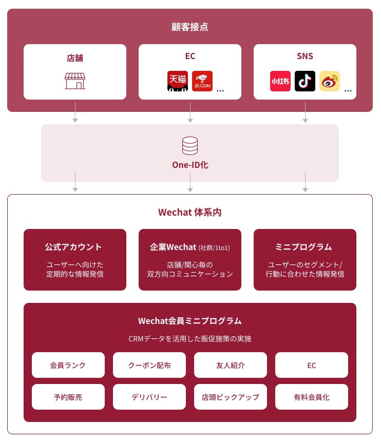 パートナーの自社会員データを利用したファンコミュニティの運営支援。クライアントの自社CRM会員データと企業Wechatをデータ連携し、会員の各購買行動にあわせたコミュニケーションを実施、実行した施策が売り上げに寄与したかをダイレクトに効果測定が可能。定期的な報告、企画、実行をPDCAで回し、伴走して運営を行います。