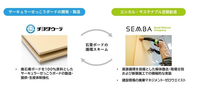 本提携では、当社が開発した100%リサイクル石膏を原料とする「チヨダサーキュラーせっこうボード」を船場の施工現場で積極的に採用いただくとともに、施工現場から排出される使用済み石膏ボードを提供頂き、再資源化する仕組みを強化します。この取り組みを通じて、石膏ボードのリサイクルを促進し、建築業界全体のサーキュラーエコノミー化を推進してまいります。
