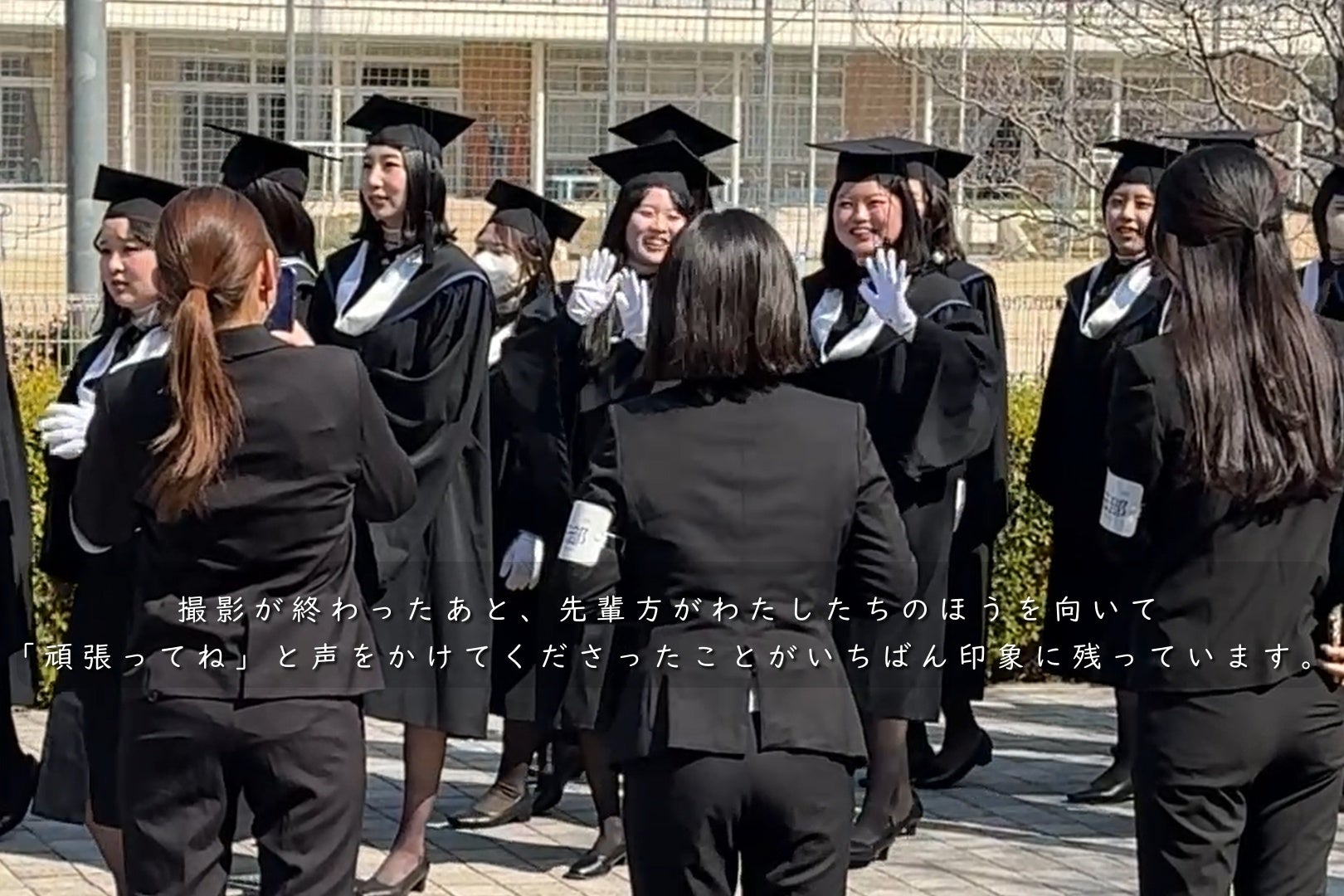 卒業式の取材で対応してくださった4年生の先輩たちは、落ち着いていて、あたたかくて、しっかりされていました。撮影が終わったあと、先輩方がわたしたちのほうを向いて「頑張ってね」と声をかけてくださったこと。それが、この取材でいちばん印象に残っています。人にやさしいこの大学にいると「4年後、自分たちもああなれるのだろう」と、自然にそう思えました。