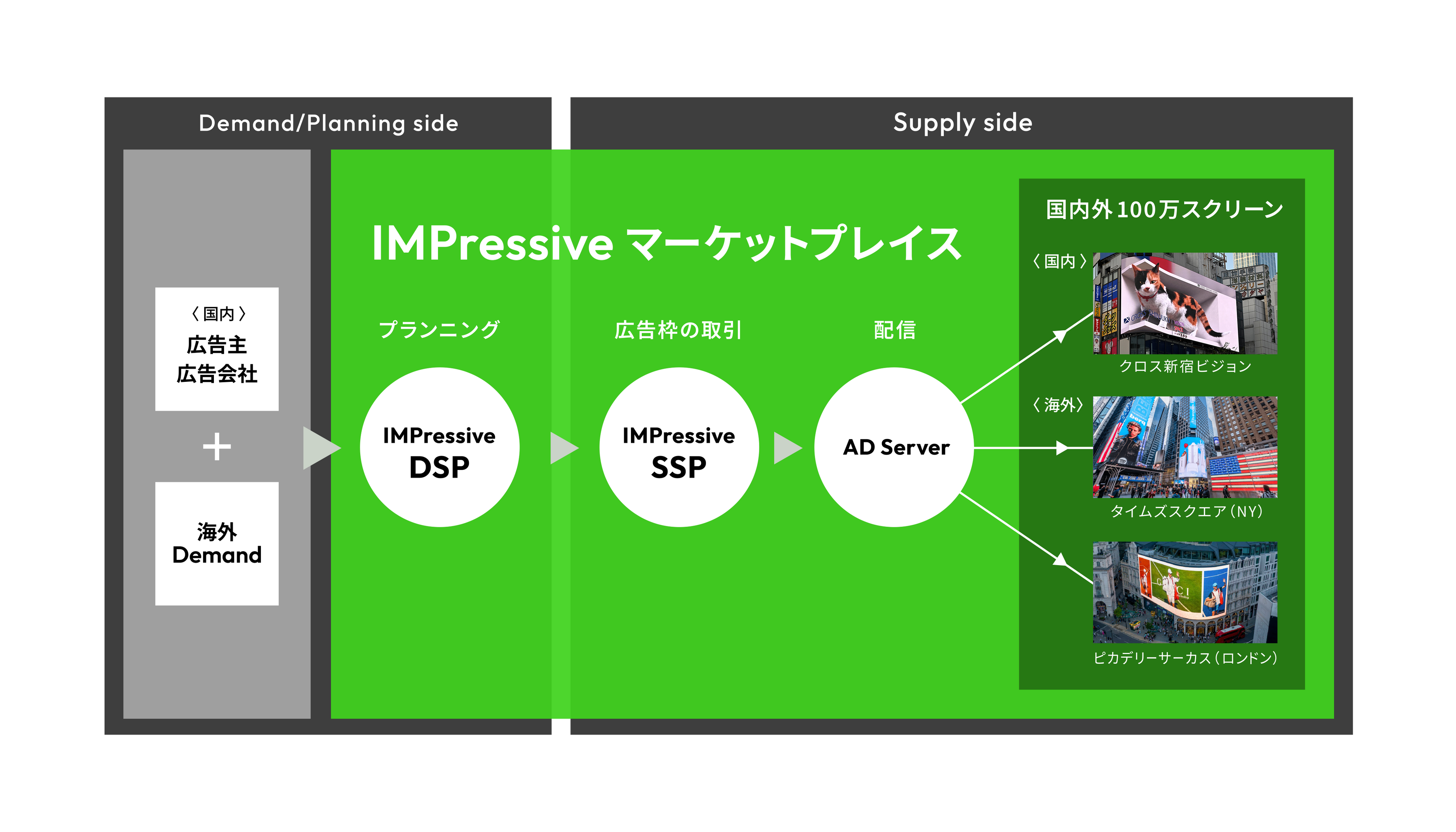 IMPressive マーケットプレイスでの取り扱い面は現在、日本国内・海外合計で120万を超えており、日本国内においても各媒体社との連携を通じて取扱メディア拡大を推進しています。クロス新宿ビジョン・ユニカビジョンをはじめとする国内各主要媒体を皮切りに、IMPressiveマーケットプレイスへの接続を拡大してまいります。