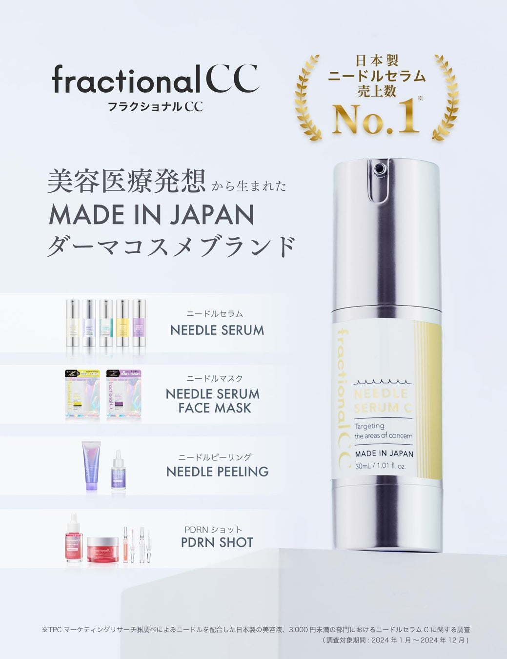 またビタミンCとグルタチオン※7を配合したニードル美容液「フラクショナルCC ニードルセラムC」は、2024年日本製マイクロニードル美容液市場(3,000円未満の部門)で売上数第1位を獲得しました※4。
