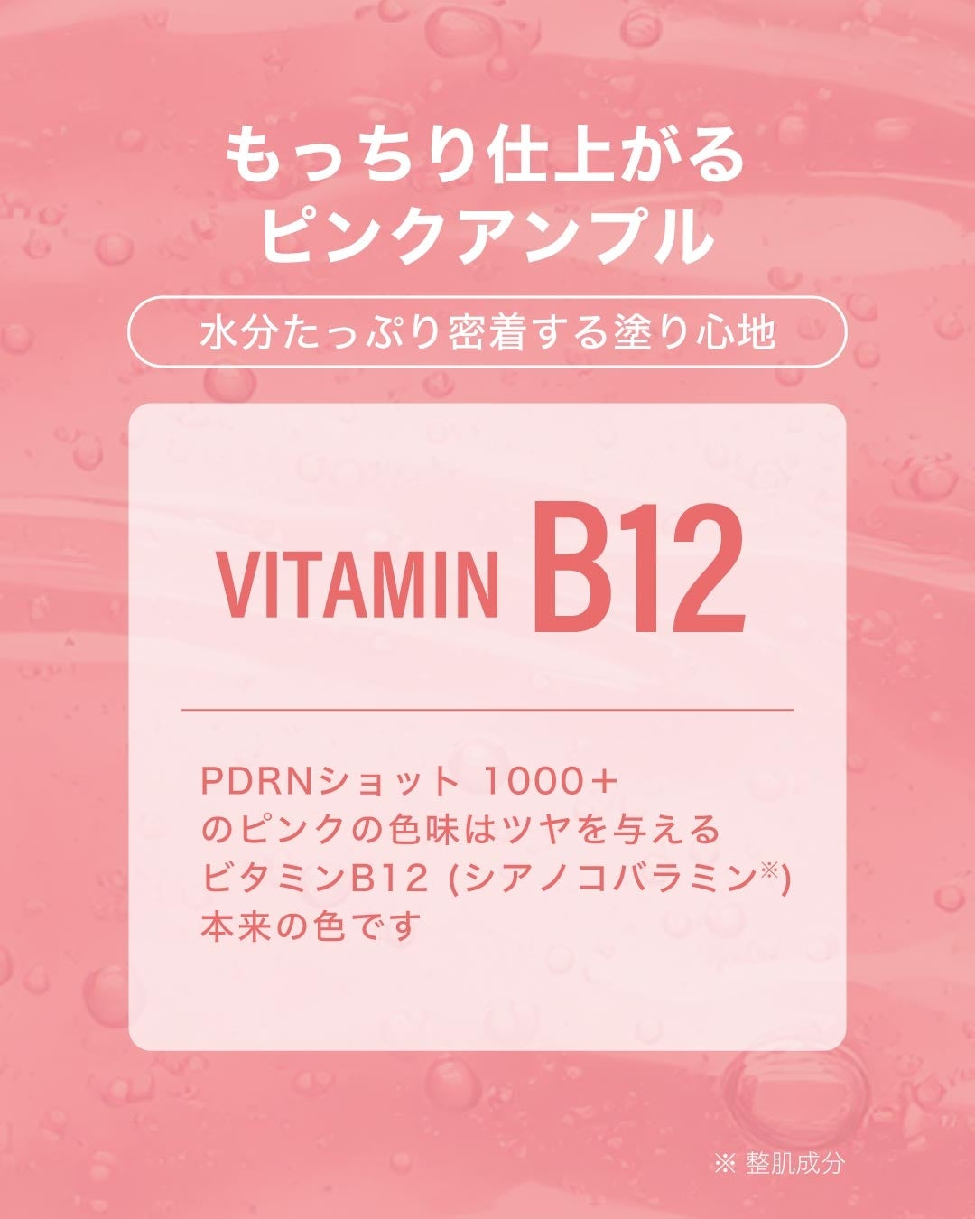 また、美容液のピンク色はツヤを与えるビタミンB12(シアノコバラミン※7)そのものの色です。濃厚な美容液がしっかり美容成分と潤いを届け※5、もっちりハリツヤのある肌に導きます。