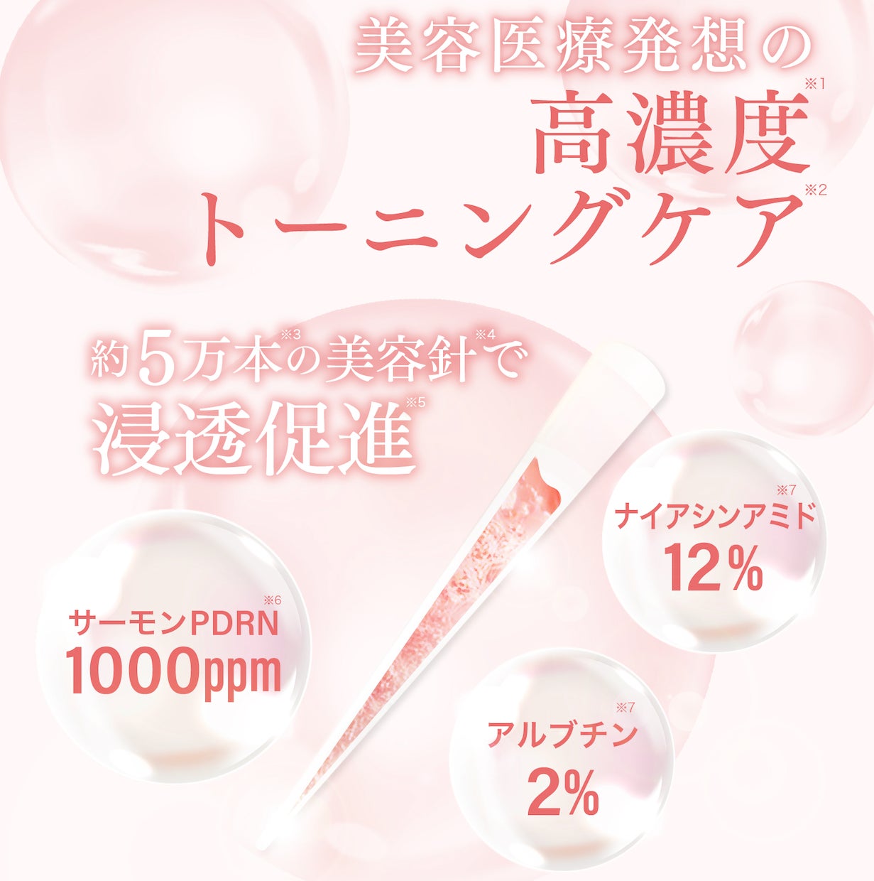 肌細胞※5に働きかけるリペア成分として韓国の美容分野で注目されている、サーモンのDNAから抽出される美容成分「PDRN※1」を1000ppm配合。攻めの高濃度※6トーニング※3成分として、12%ナイアシンアミド※7と2%アルブチン※7を組み合わせ、肌の透明感※3を管理する水光美容液です。
