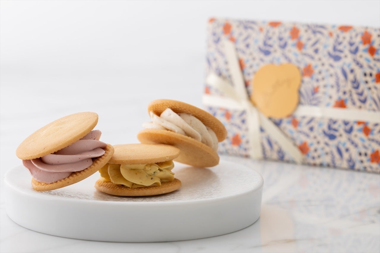 北海道バターと旬の食材を合わせた季節限定のバタークリームを、サクサク食感のクッキーで挟む『バタリーサンド』。9月1日(日)から期間限定販売となる秋のフレーバーには、ヘーゼルナッツリキュールが香る、大人な味わいの「栗」が登場。濃厚かつ栗の優しい甘さが引き立つ1品です。さらに、かぼちゃの味わいと、パンプキンシード・ペカンナッツ・クルミのザクザクとした食感が特徴の「メープルかぼちゃ」。爽やかな酸味が絶妙な「カシス」など。秋を感じる贅沢なバターサンド3種を、1缶に詰め合わせました。フリルのように可憐で、色鮮やかなバタークリームも魅力のひとつ。オリジナルデザインの花柄クッキー缶が華やかな『バタリーサンド』は、自分へのご褒美にはもちろん、手土産にもおすすめです。