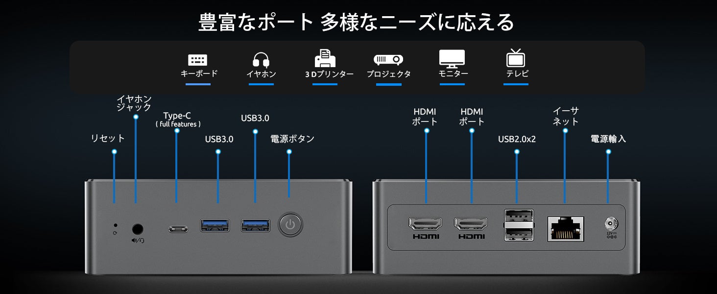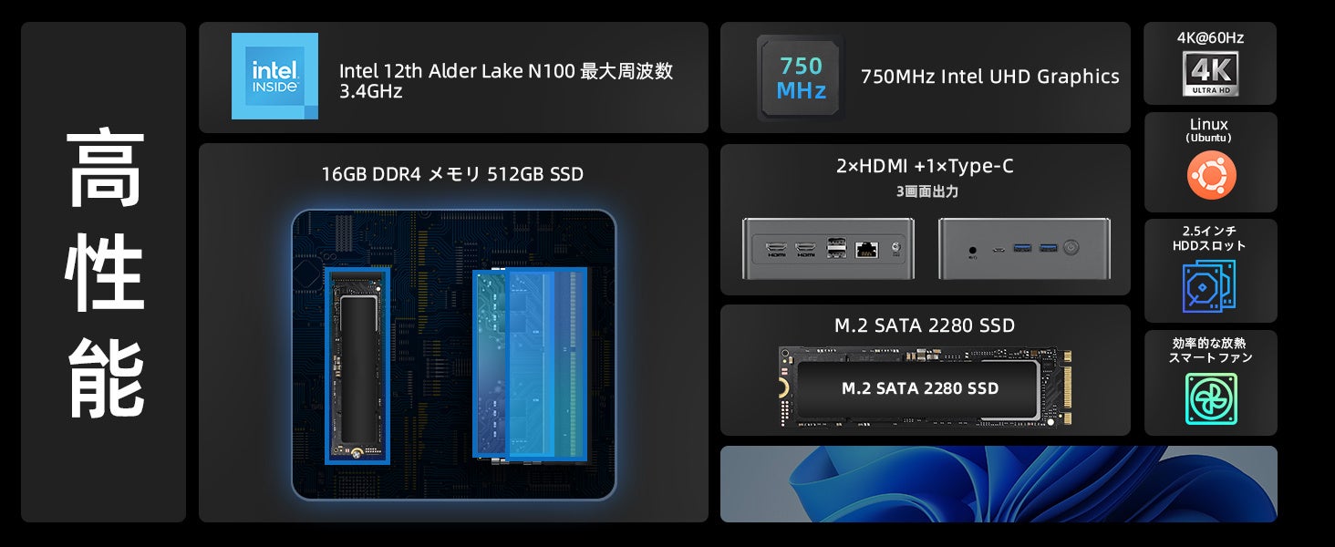 N100は、第12世代インテルAlder Lake N100 mini pc プロセッサーと高速16GBデュアルチャネルDDR4 SO-DIMMメモリ、超高速512GB SSDを組み合わせることで、起動時間の改善とアプリケーションプログラム起動の高速化を実現しています。4コア4スレッド、6MBのキャッシュ、10nmの先進技術、パルス周波数3.4 GHz。