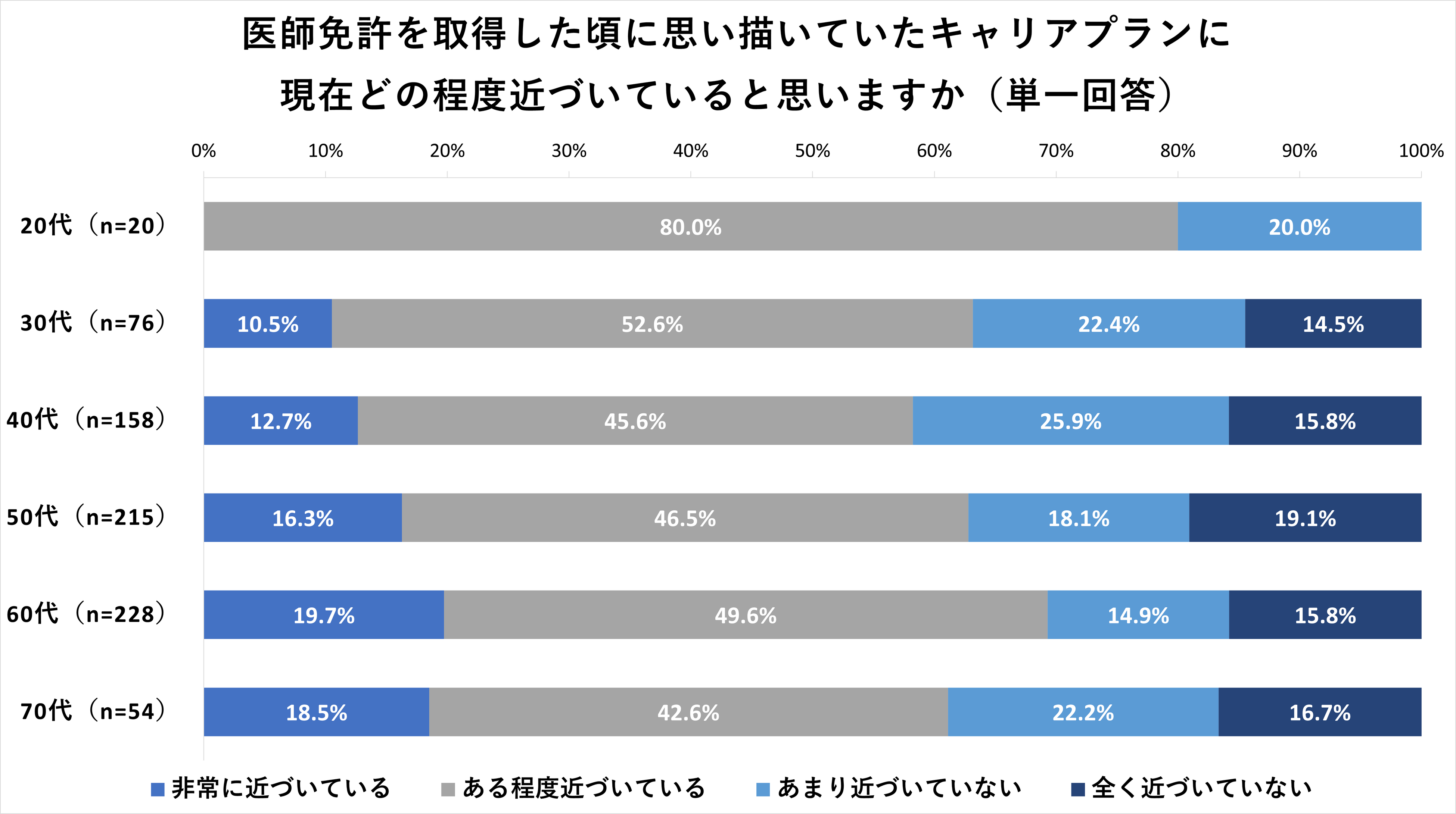 しかし、「思い描いたキャリアプランに現在どの程度近づいていると思うか」という設問では、30~40代は専門性の追求と生活との両立を思い描くなかで、相対的に理想に近づけていないと感じる割合が高いことが分かりました。30代では「非常に近づいている」と回答した医師はわずか10.5%で、「あまり近づいていない」「全く近づいていない」の計が36.9%を占めています。40代も同様に「あまり近づいていない」「全く近づいていない」と感じる割合が合わせて41.7%に上りました。これに対して50~60代では「非常に近づいている」「ある程度近づいている」の計が高くなり、特に60代では69.3%が「非常に近づいている」「ある程度近づいている」と感じていることが分かります。
