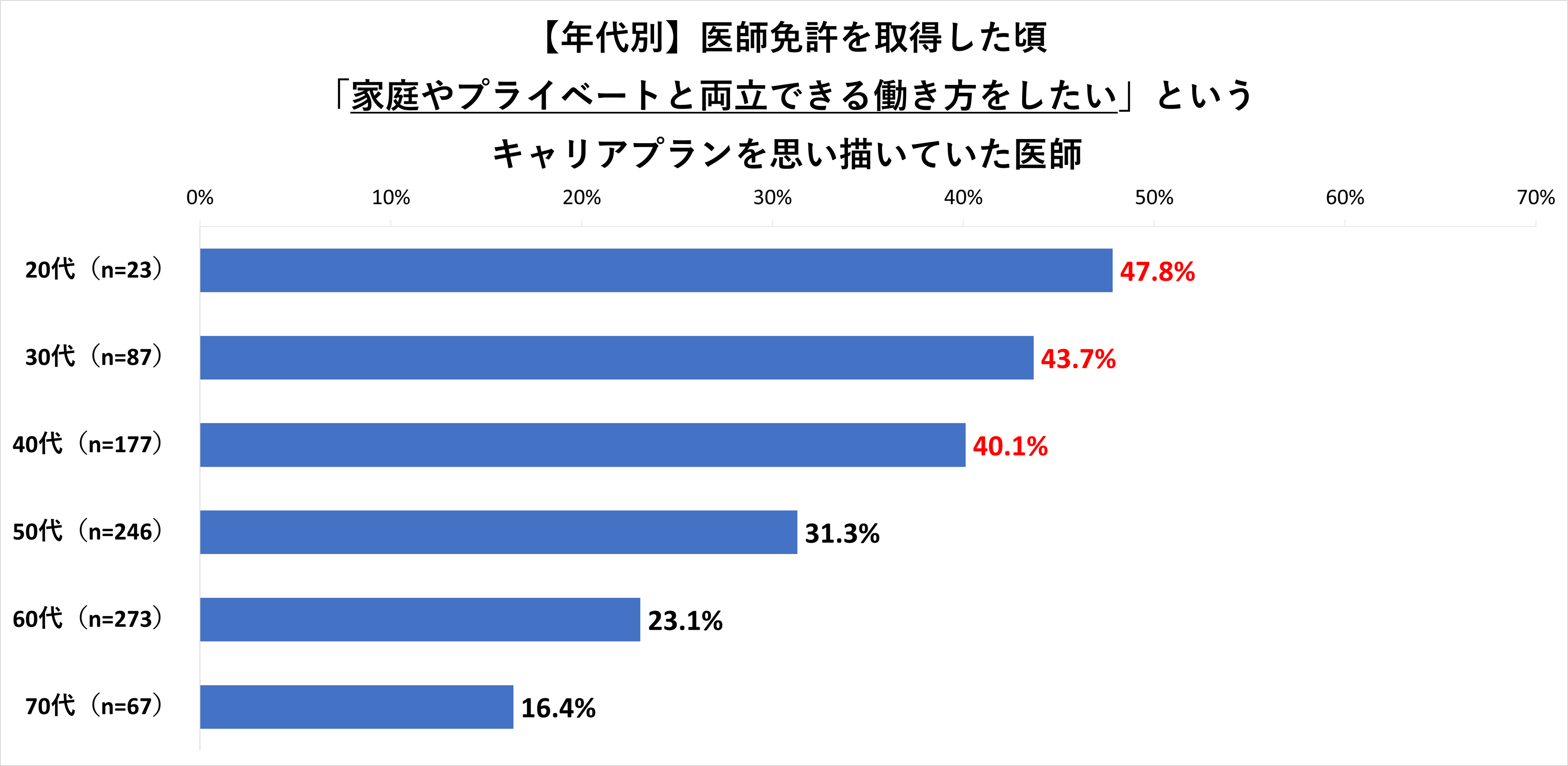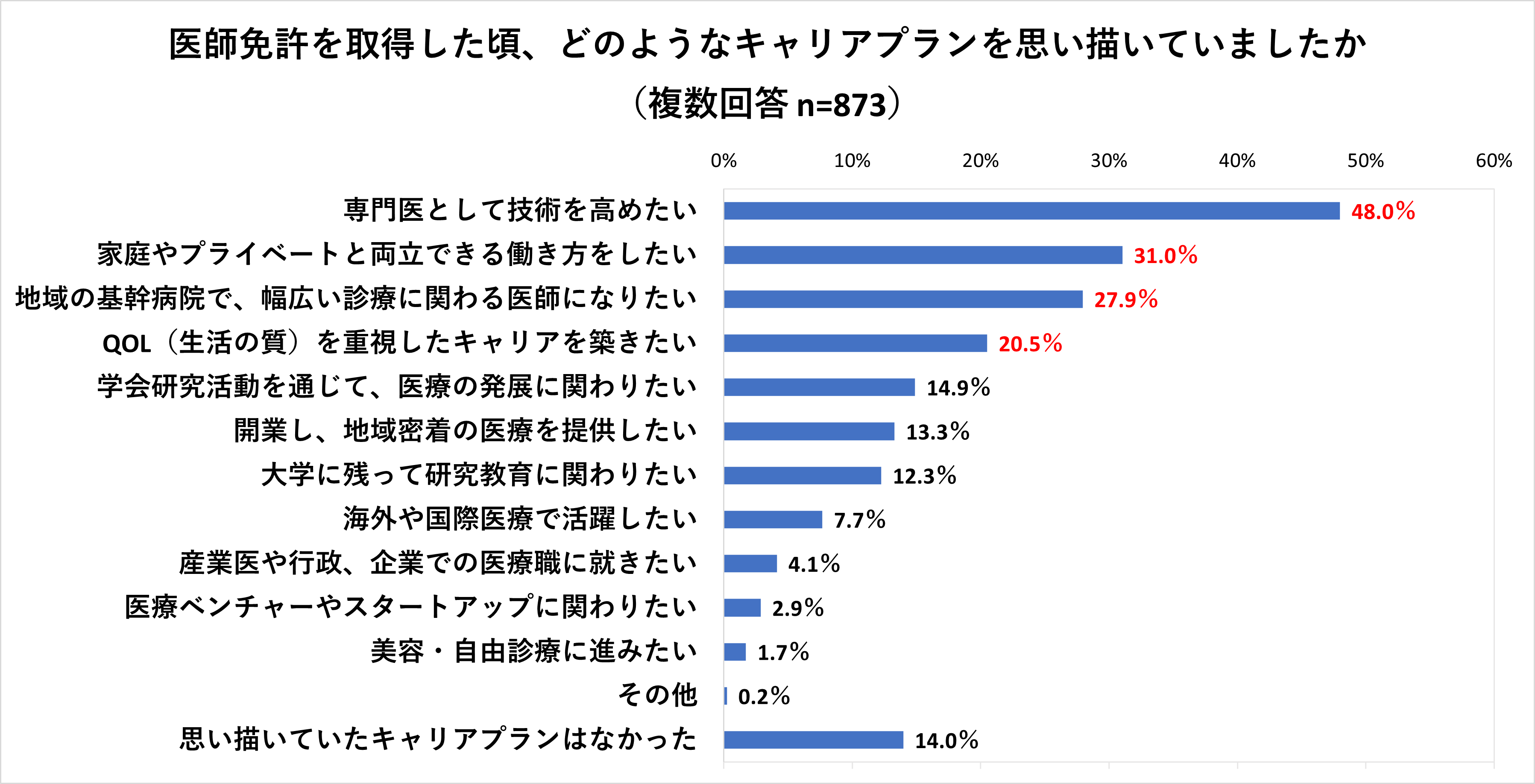 免許取得当初に思い描いたキャリアプランとして最も多かったのは「専門医として技術を高めたい」(48.0%)で、続いて「家庭やプライベートと両立できる働き方をしたい」(31.0%)、「地域の基幹病院で、幅広い診療に関わる医師になりたい」(27.9%)でした。また「QOL(生活の質)を重視したキャリアを築きたい」(20.5%)も一定の割合を占め、専門性の追求と生活との両立を志向する意識が確認されました。