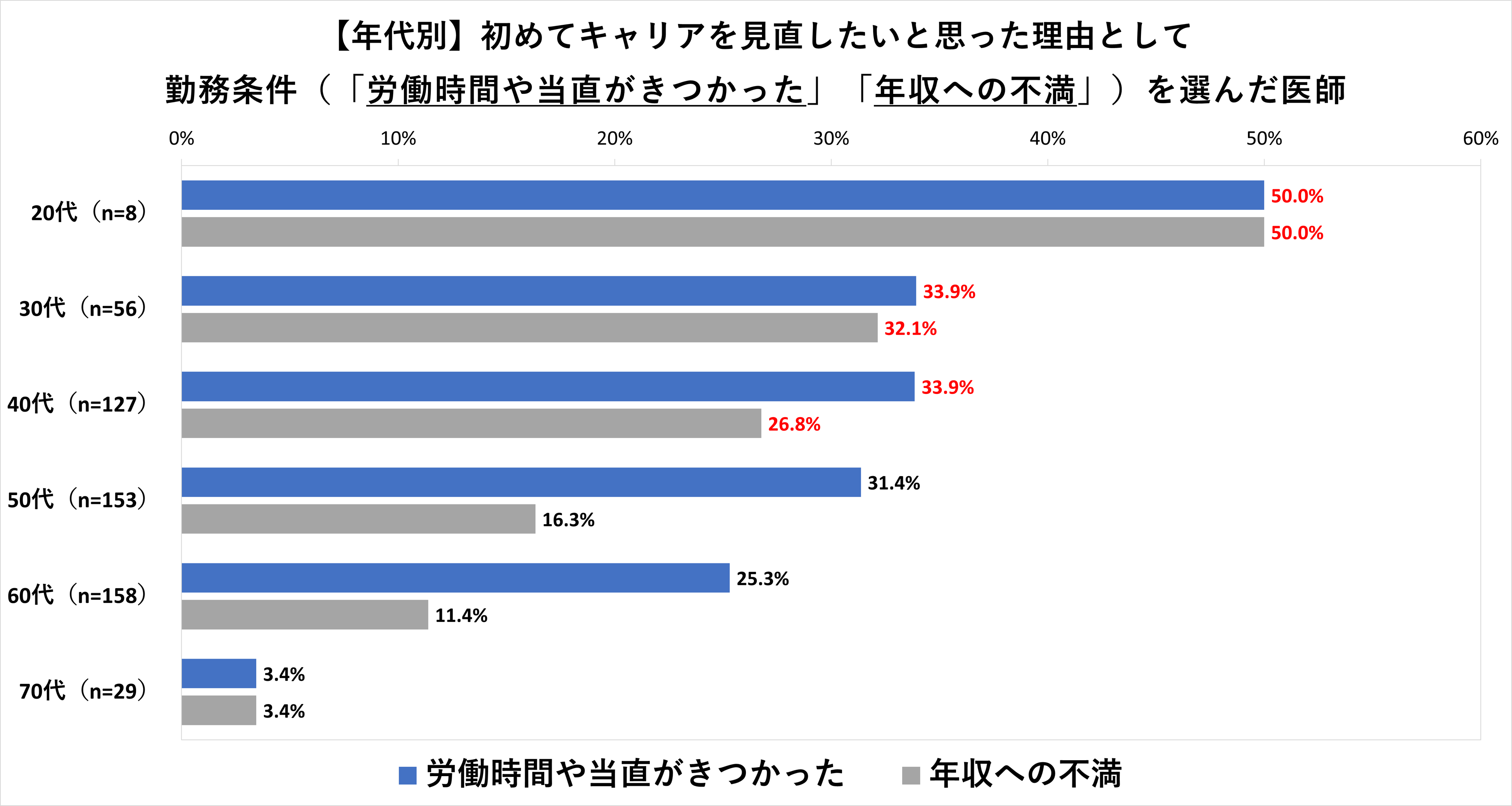 一方、「労働時間や当直がきつかった」「年収への不満」といった勤務条件を理由にした割合は、20代でいずれも50.0%、30~40代でも3割前後でした(20代はn数僅少のため参考値)。過酷な勤務や将来への不安が、若手世代において初めてのキャリア再考の契機となったと考えられます。これに対し50代以上では両項目とも割合が低く、勤務条件を理由に「初めて」キャリアを見直そうとした医師は相対的に少数でした。