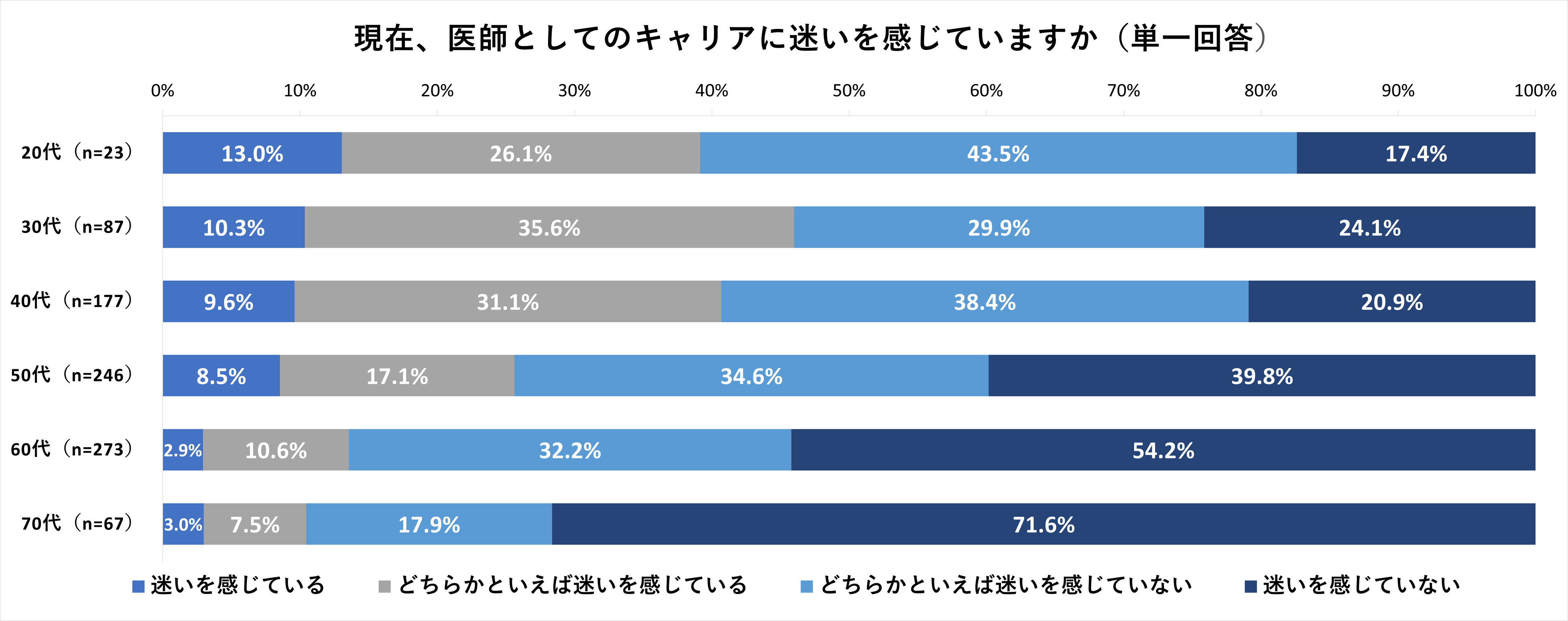 一方で、50代以上では「迷いを感じていない」の割合が高くなり、特に60代(54.2%)、70代(71.6%)では半数以上がキャリアに「迷いを感じていない」ことが分かりました。長いキャリアを経て自分なりの道を確立した医師が多く、迷いが少なくなる傾向があると考えられます。