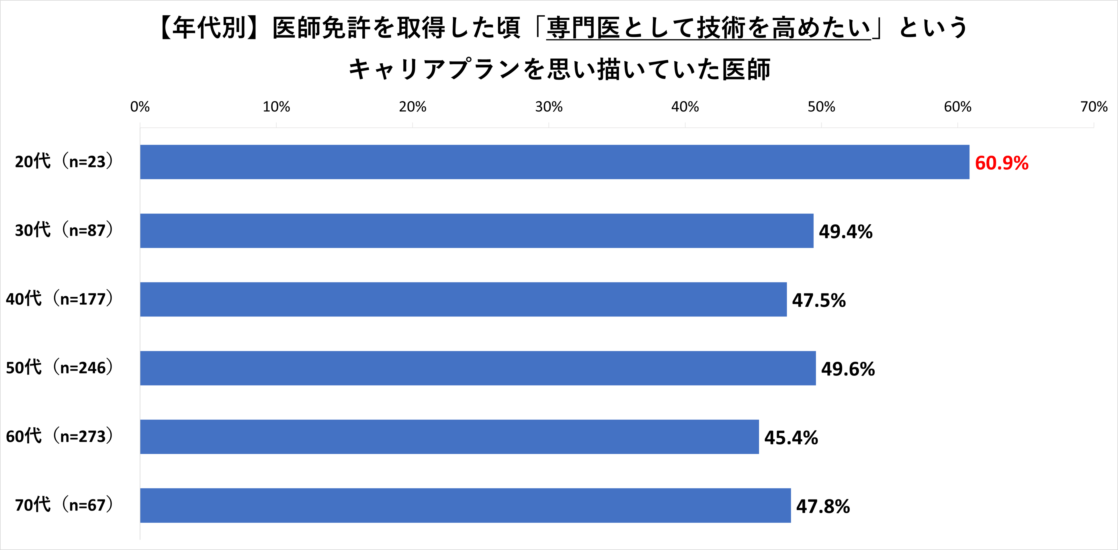 年代別に見ると、「専門医として技術を高めたい」は20代で60.9%と最も高く、30代以上は40%台後半で、70代でも47.8%といずれの年代でも高い割合となっています。一方、「家庭やプライベートと両立できる働き方をしたい」は20代(47.8%)、30代(43.7%)、40代(40.1%)と若手世代では40%台ですが、50代以上は低く、70代では16.4%にとどまりました。若年層では生活面の充実を重視する傾向が相対的に高いことがうかがえます。