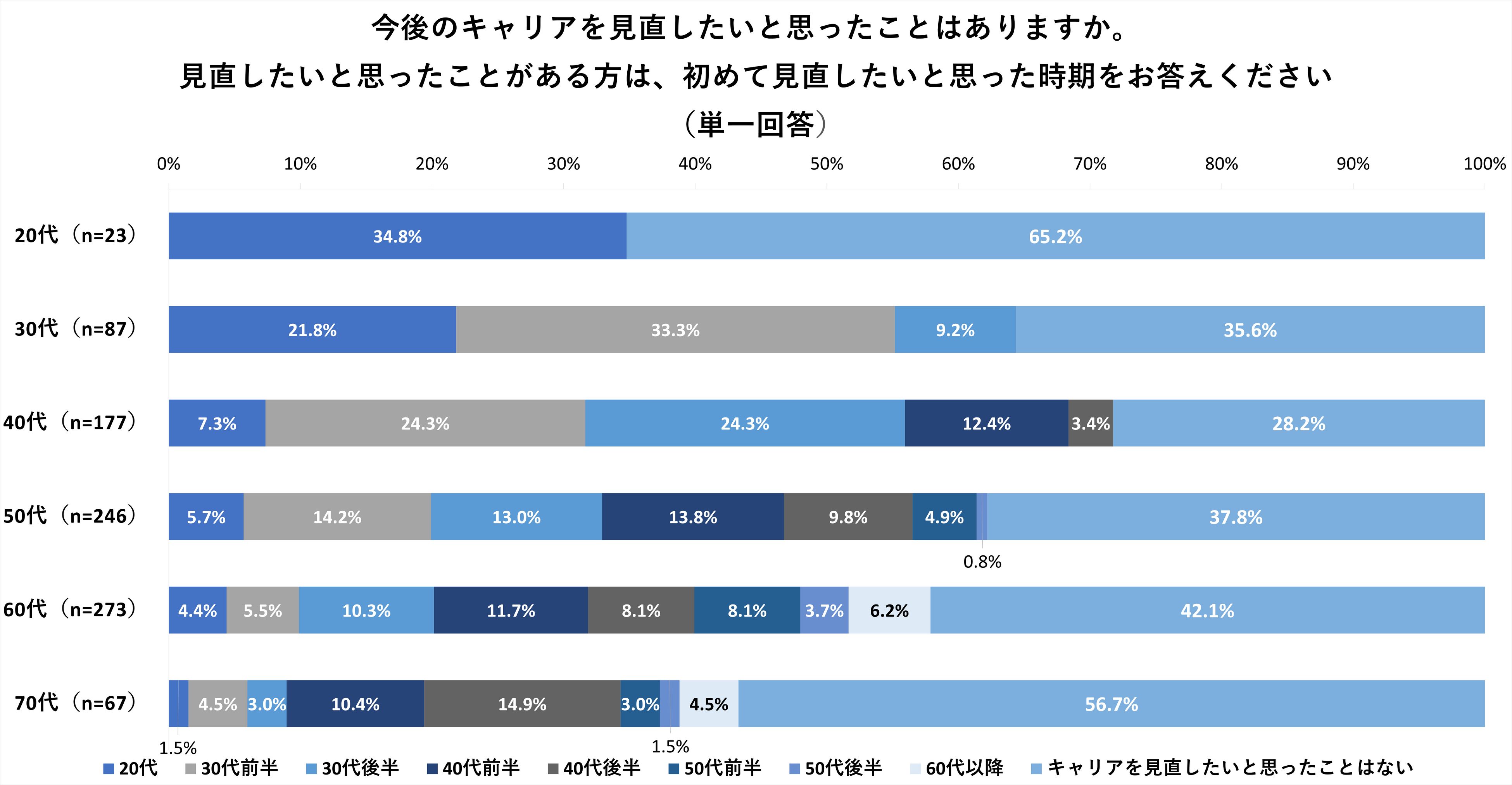 一方で50代以上は傾向が異なります。「キャリアを見直したいと思ったことはない」が高くなり、50代では37.8%、60代では42.1%、70代では56.7%と過半数に達しました。また、見直しを検討した場合でもその時期は若手世代に比べて遅く、60代以上では「初めて見直したいと思ったのは40代以降」とする回答が一定数を占めています。これらの結果からは、年代によってキャリアへの向き合い方や、見直しのきっかけに違いがあることがうかがえます。