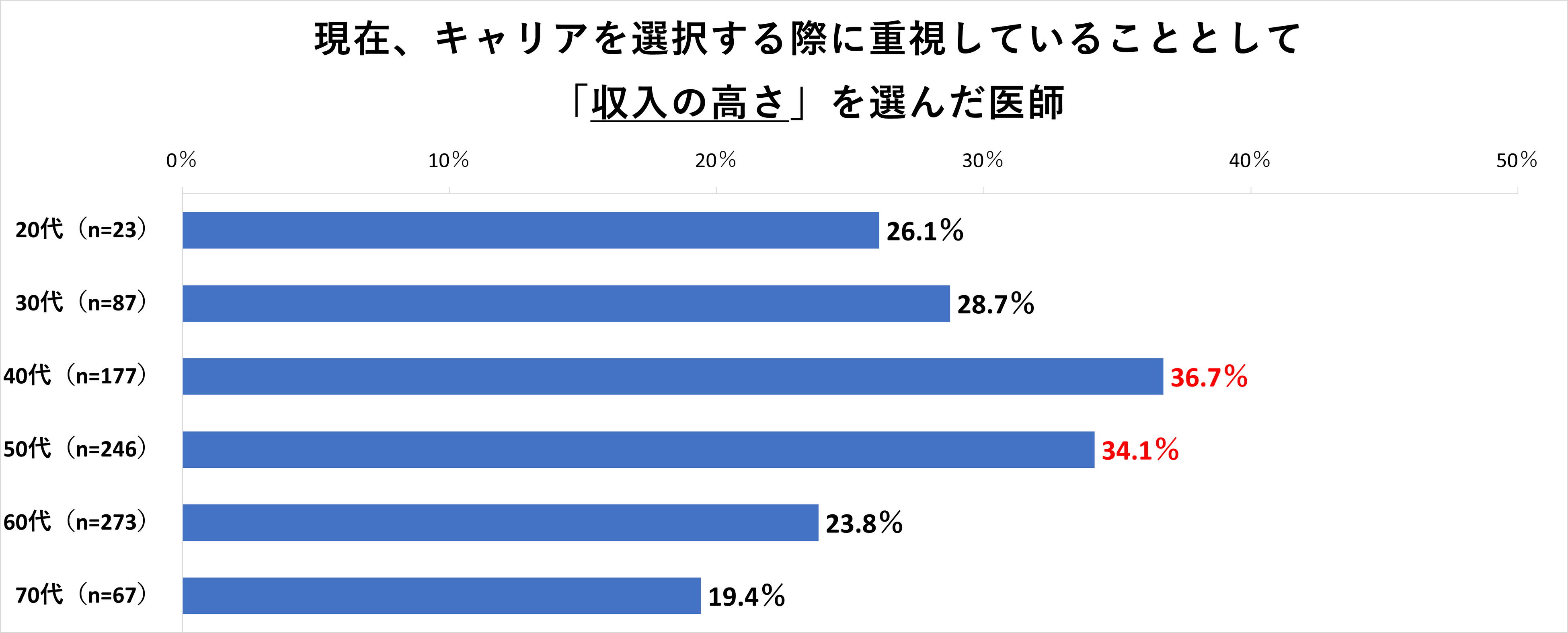 最も多くの医師が重視したのは「収入の高さ」でしたが、この項目はどの年代でも一定の割合を占め、特に40代(36.7%)、50代(34.1%)では他の年代よりも高い傾向が見られました。家庭や教育費など、経済的な責任が増す時期に重視されやすいと考えられます。