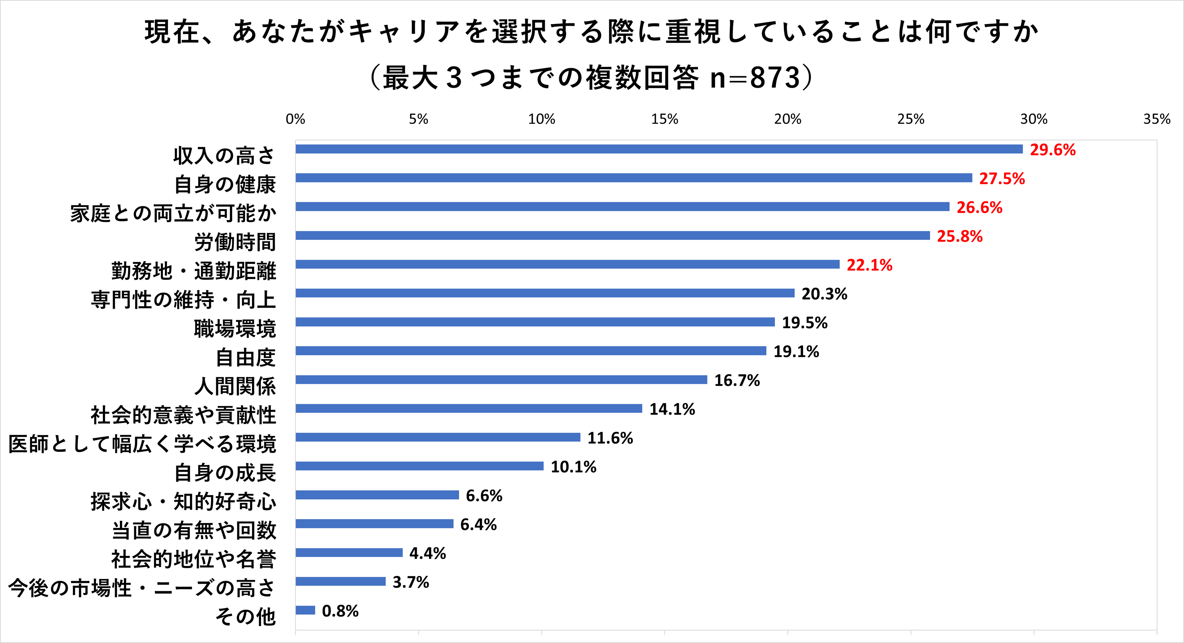 医師たちは実際にキャリアを選ぶ際、どのようなことを重視しているのでしょうか。最も多くの医師が選んだのは「収入の高さ」(29.6%)でした。続いて「自身の健康」(27.5%)、「家庭との両立が可能か」(26.6%)、「労働時間」(25.8%)、「勤務地・通勤距離」(22.1%)が上位に並びました。全体としては、安定した勤務条件の下でプライベートと調和を保ちながら、長く健やかにキャリアを積んでいきたいという意思が浮かび上がります。