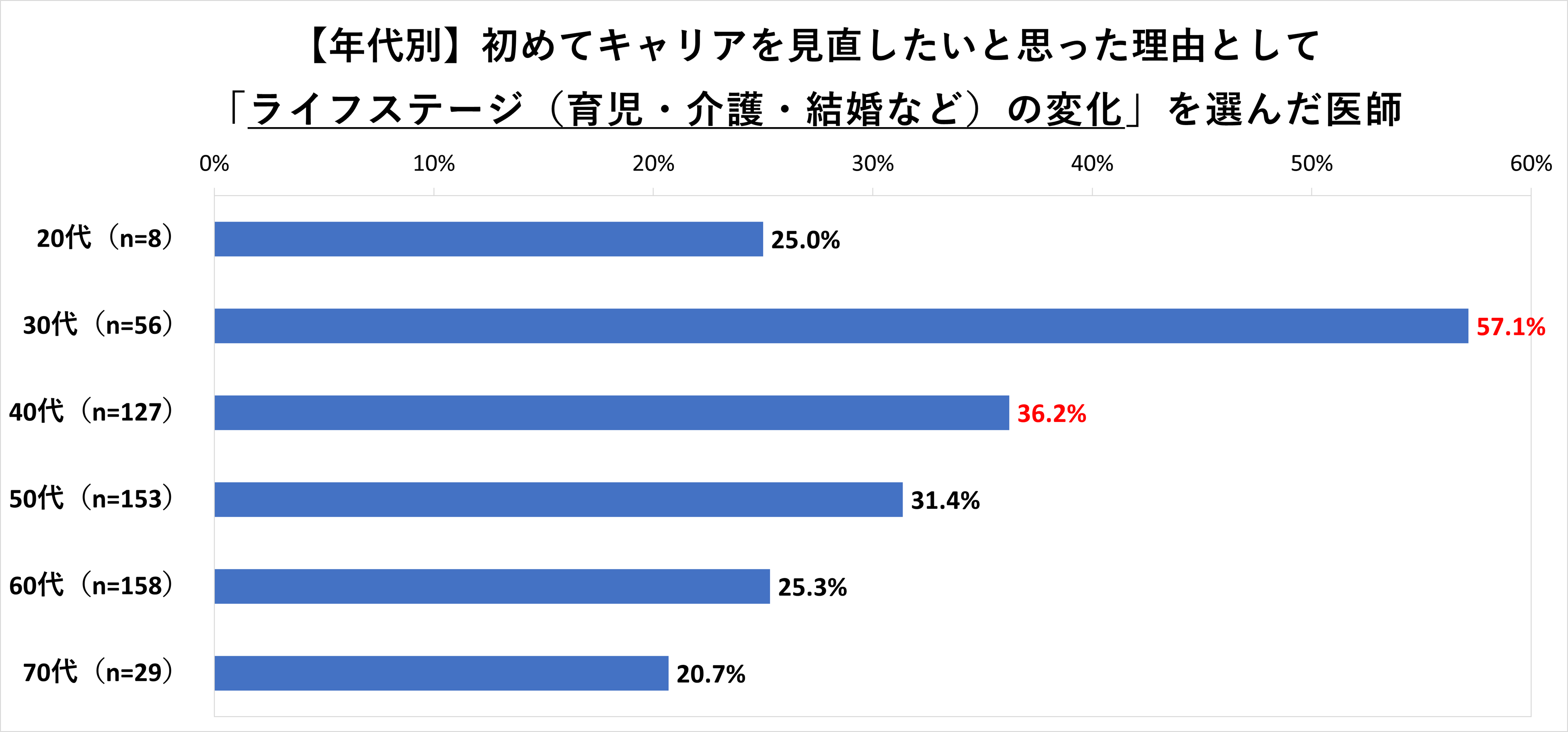 「ライフステージの変化」を理由に挙げた割合は30代で57.1%と突出して高く、40代でも36.2%に上りました。先述の通り、現在30~40代の医師が初めてキャリアを見直した時期は「30代」の割合が高く、まさにライフステージの変化が集中する時期にキャリア見直しの意識が高まったことがうかがえます。