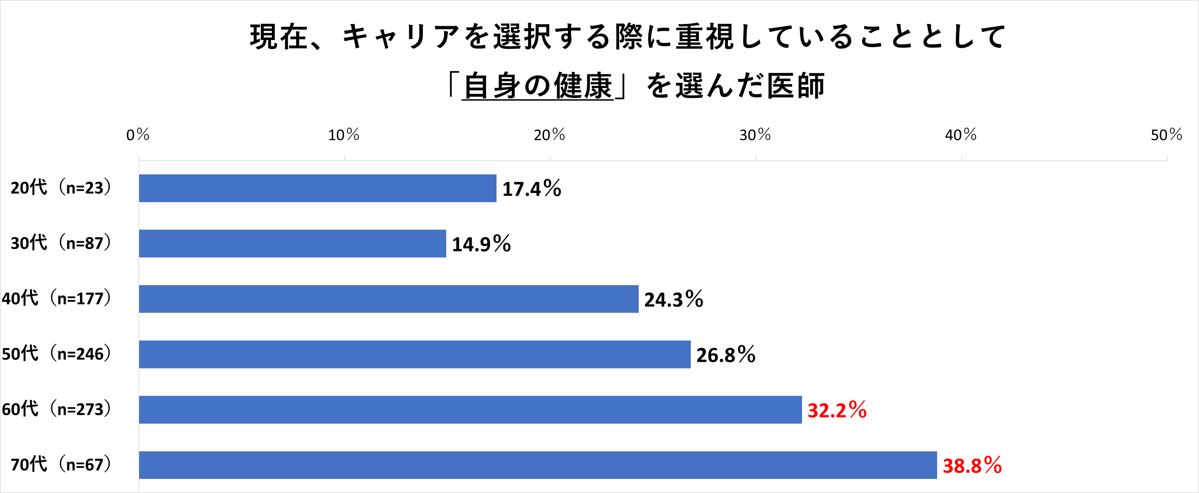 一方で「自身の健康」を重視する割合は年代が上がるにつれて高くなっており、20~30代では2割未満にとどまる一方、60代では32.2%、70代では38.8%に達しました。長年の勤務を経て健康がキャリアの持続可能性に直結することを強く意識する姿が浮かび上がります。