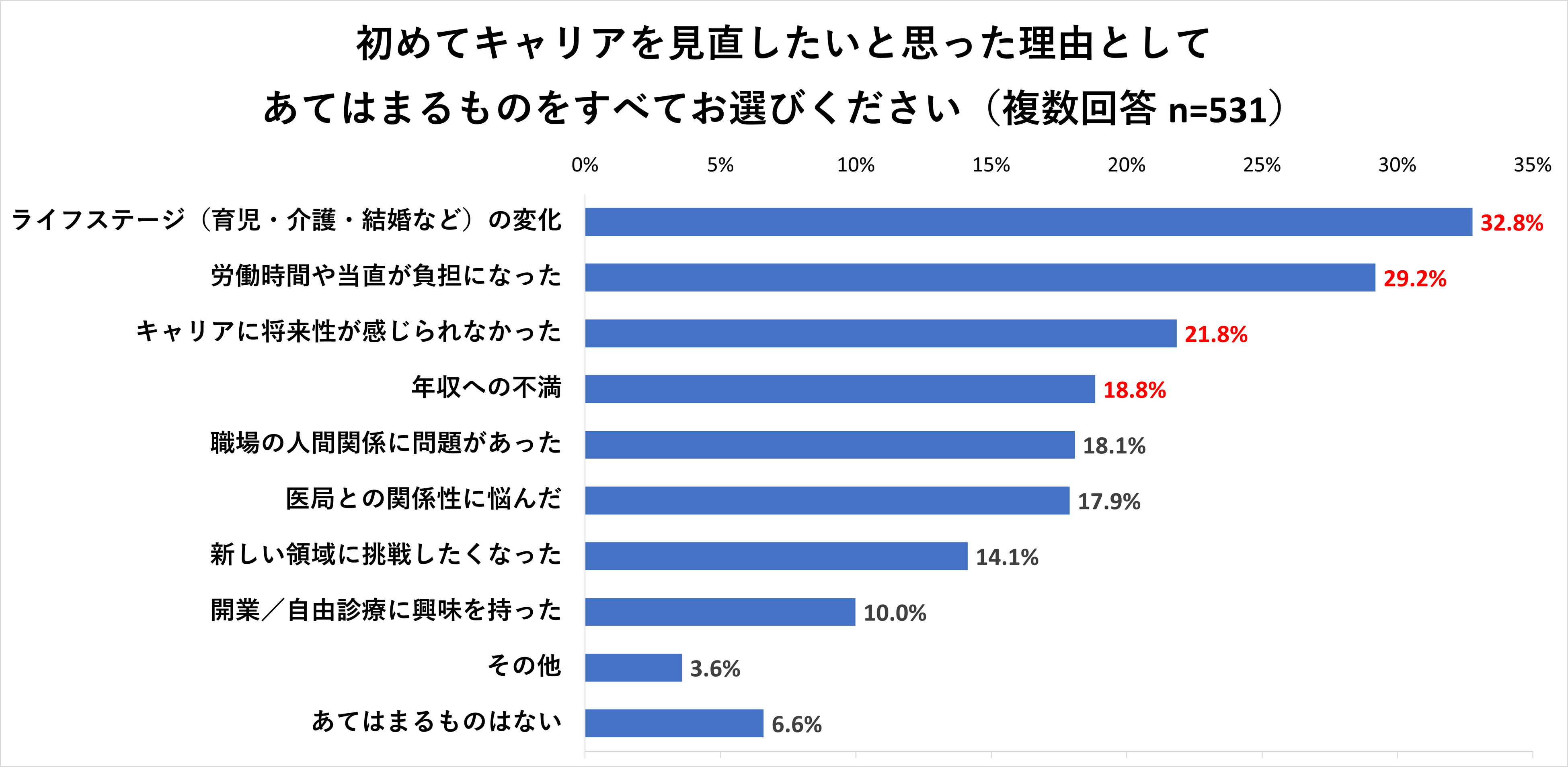 最も多かったのは「ライフステージ(育児・介護・結婚など)の変化」(32.8%)、続いて「労働時間や当直が負担になった」(29.2%)で、いずれも生活や勤務環境に直結する要因が上位を占めました。また「キャリアに将来性が感じられなかった」(21.8%)や「年収への不満」(18.8%)も一定の割合を占め、経済的要素や将来像の不透明さがキャリア再考の背景となっていることが分かります。