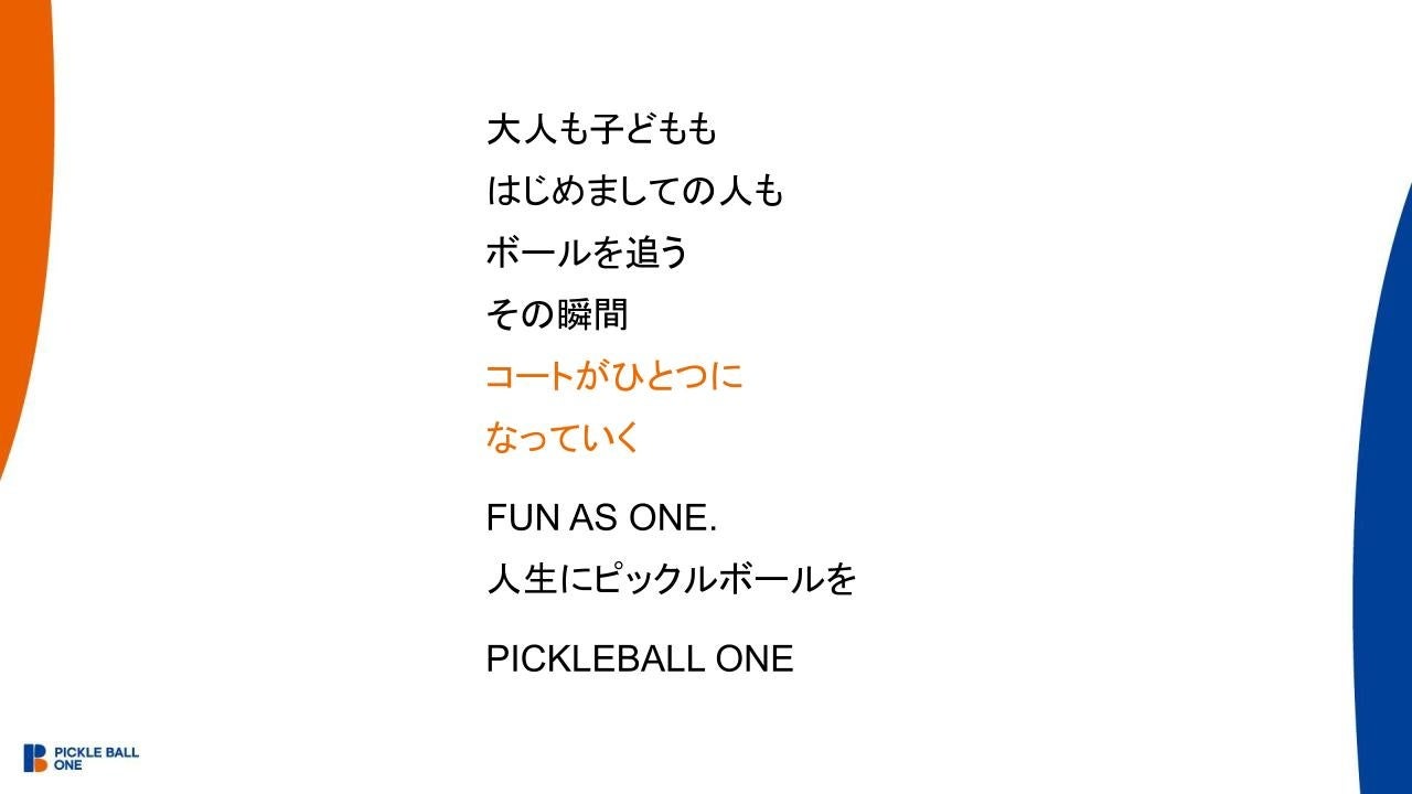 「ピックルボールには、人と人とを自然につなぎ、コミュニケーションを生み出し、あらゆる人が笑顔になる力があると信じています。私たちピックルボールワンは “FUN AS ONE ひとつになる楽しさ ” を体現し続けながらピックルボール産業の発展に精進して参ります。」