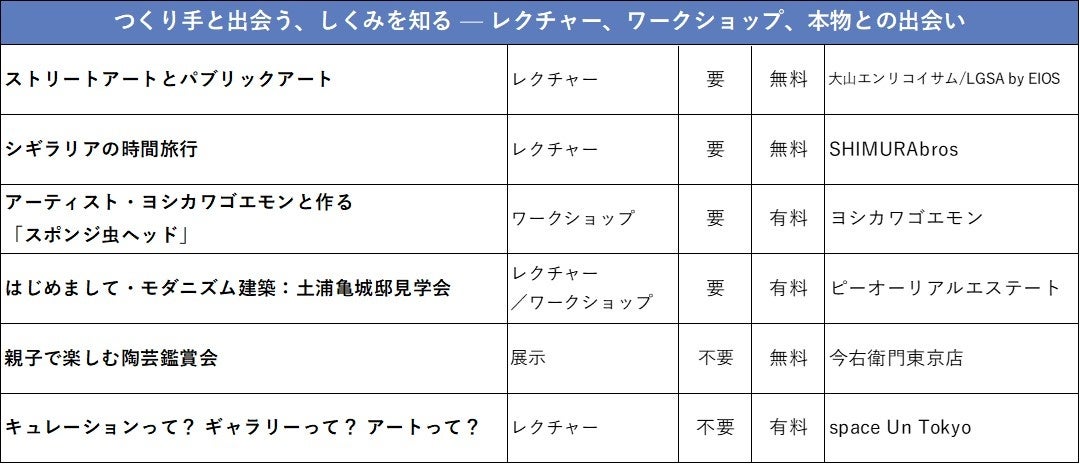 第一線で活躍するアーティストによるプログラムやギャラリーのレクチャーや展示も充実。作品の“向こう側”にある考えやプロセスにぐっと近づきます。ポーラ青山ビルディングに作品を設置する大山エンリコイサム、SHIMURAbrosのアーティストトークやスポンジアーティスト・ヨシカワゴエモンによるワークショップなど。同じ作品でも、話を聞いた後、手を動かし創造した後では、まったく違った見え方ができるかもしれません。
