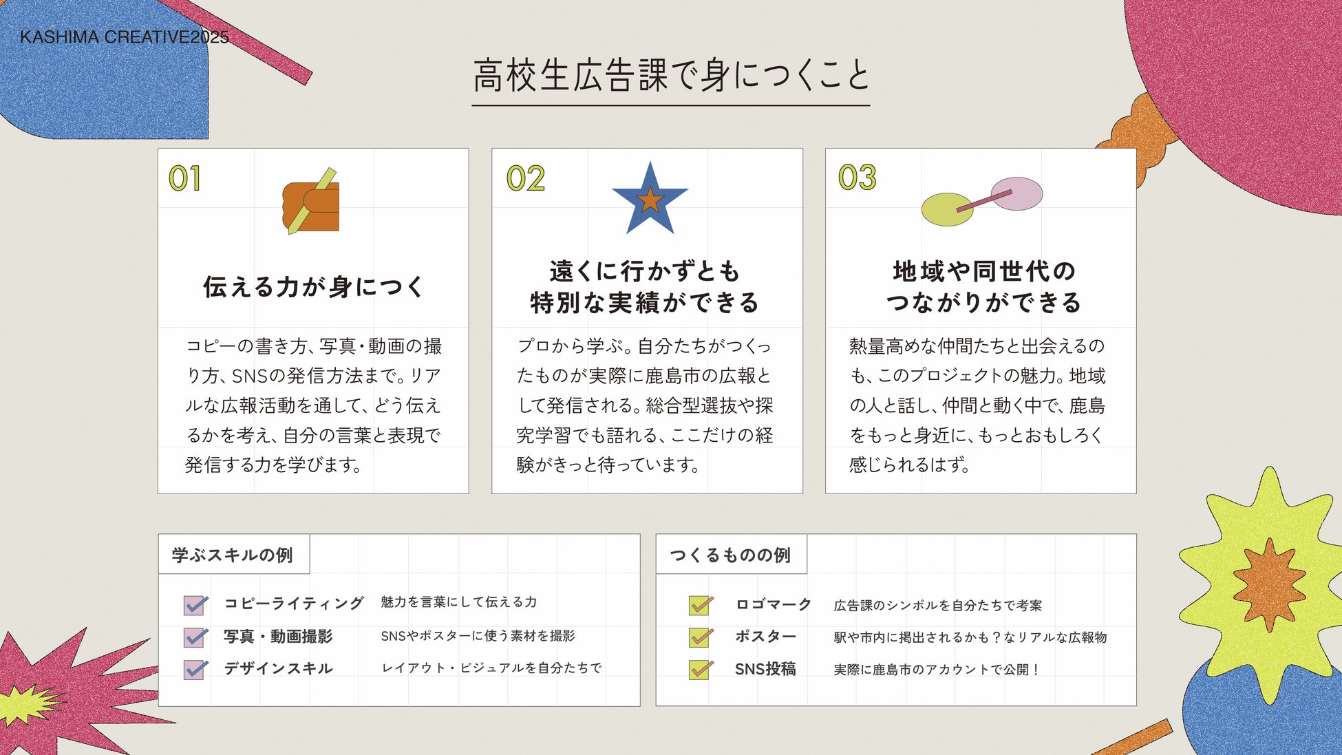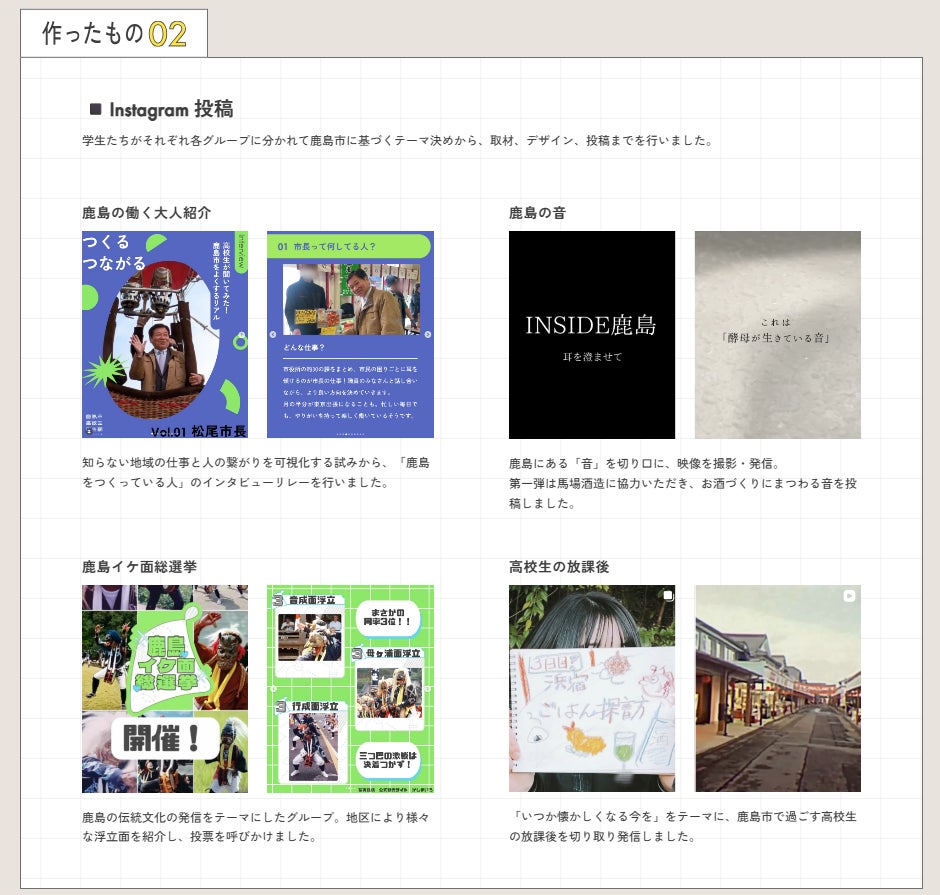 令和7年度は、プロのクリエイターや編集者、カメラマンなどを講師とするワークショップを経て、鹿島市ロゴ・キャッチコピーの制作や鹿島市の魅力を発信するSNS投稿を行いました。