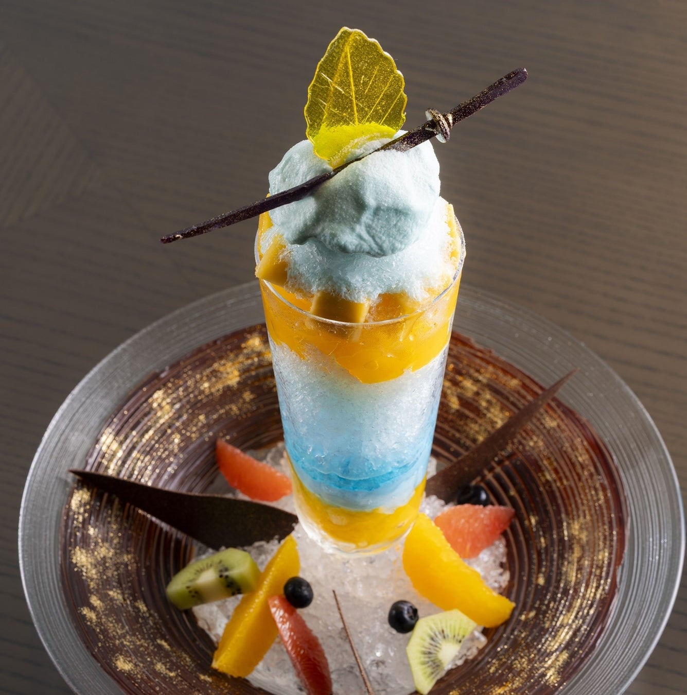 「マンゴー&サイダー HIDEYOSHI」は、良く熟れた濃厚なマンゴーと大阪らしいサイダーを使用したシロップを組み合わせ、暑い夏でもさっぱりと楽しめる爽やな味わいです。大阪城を築城したことでも有名な豊臣秀吉のイメージカラーは黄金。フワフワのエスプーマからのぞく凛とした刀は、繊細な飴細工で作られており、兜をイメージした煌びやかな飴細工と合わさって、戦国時代を想わせる仕上がりです。秀吉の兜のデザインは、花の菖蒲(しょうぶ)の一種である「馬藺(ばりん)」の葉を複数重ね、後光のように広げることで、秀吉の天下人としての威厳と華やかさを表していると言われています。大阪城の絶景を眺めながら、この地の歴史に想いを馳せるのもオススメです。