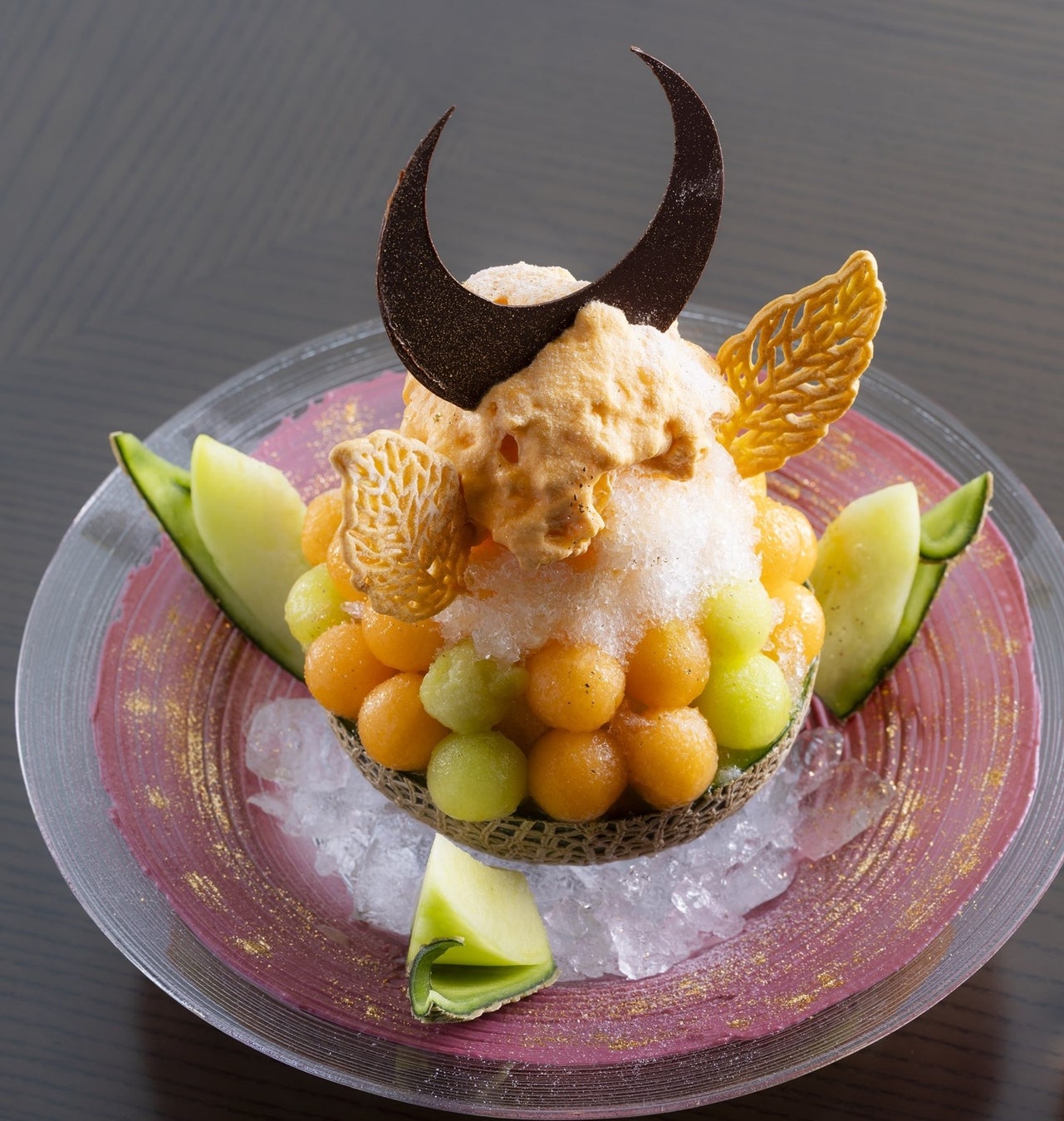 大阪城天守閣はもちろん、豊かな緑や石垣を眺めながらお楽しみいただけるかき氷セレクションの中でもペストリーシェフ山口の一番のおすすめ「丸ごとメロン IEYASU」は、メロンをゴロっと一玉使用した贅沢なかき氷です。徳川家康の兜は、長寿と子孫繁栄を願うシダの葉をモチーフとしているため、このかき氷もシダをイメージさせるシュー生地をあしらい、崇高な紫でプレートを彩ります。さらに、丸くくりぬいた2種のメロンと相性ピッタリの紅茶のジュレもこだわり要素の一つ。メロン風味のアイスクリームやエスプーマ、別添えのメロンシロップと合わせてお召し上がりいただくと、より上品な香りをお楽しみいただけます。