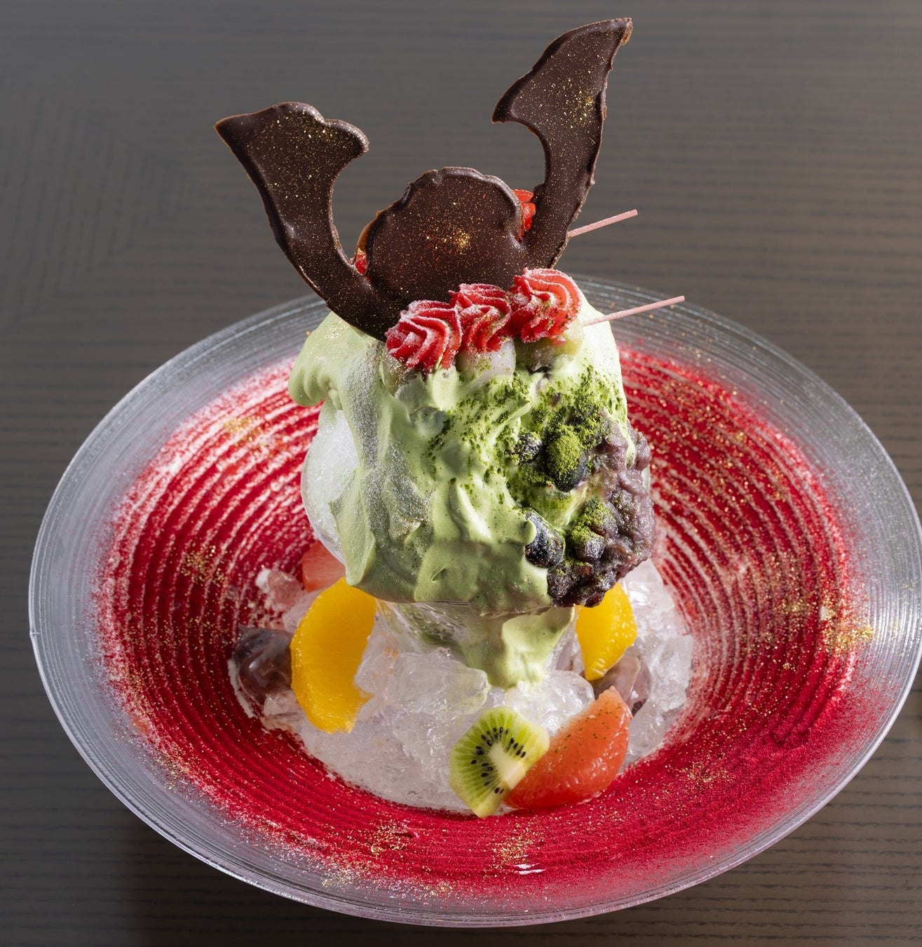 和の要素をたっぷりと味わえる「宇治抹茶あずき NOBUNAGA」は、その名の通り、織田信長より名づけられています。萌葱色(もえぎいろ)の肩衣(かたぎぬ)をイメージした抹茶のかき氷には、力強い信長をイメージさせるチョコレートの兜と、真っ赤な装飾を施しています。ふんだんに使った宇治抹茶、さらにはラズベリー風味の白あんが爽やかな白玉団子、練乳、小豆をトッピングし、抹茶の軽いクリームエスプーマを添えることで口の中で氷が溶けにくいように考案されており、より長く抹茶の香りが楽しめます。抹茶好きの方は、抹茶蜜の追いシロップで甘さをご調整いただけます。