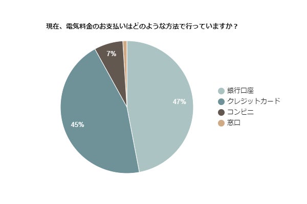 電気料金の支払い方法について調査を行ったところ、「銀行口座」が47%、「クレジットカード」が45%と、ほぼ同数の結果となりました。