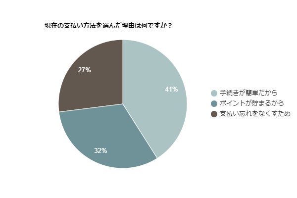 現在の支払い方法を選択した理由について、「手続きが簡単だから」と回答した方が41%と多く、次いで「ポイントが貯まるから」が32%、また「支払い忘れをなくすため」が27%との結果となりました。