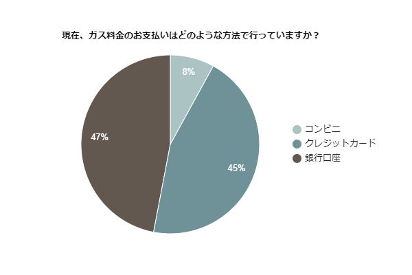 ガス料金の支払い方法について調査したところ、「クレジットカード」が45%、「銀行口座」が47%と近い数の回答が集まりました。
