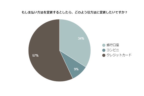 もし支払い方法を変更するとしたら、どのような方法に変更したいかという質問に対し、「クレジットカード」と回答した方が57%と半数以上を占めました。