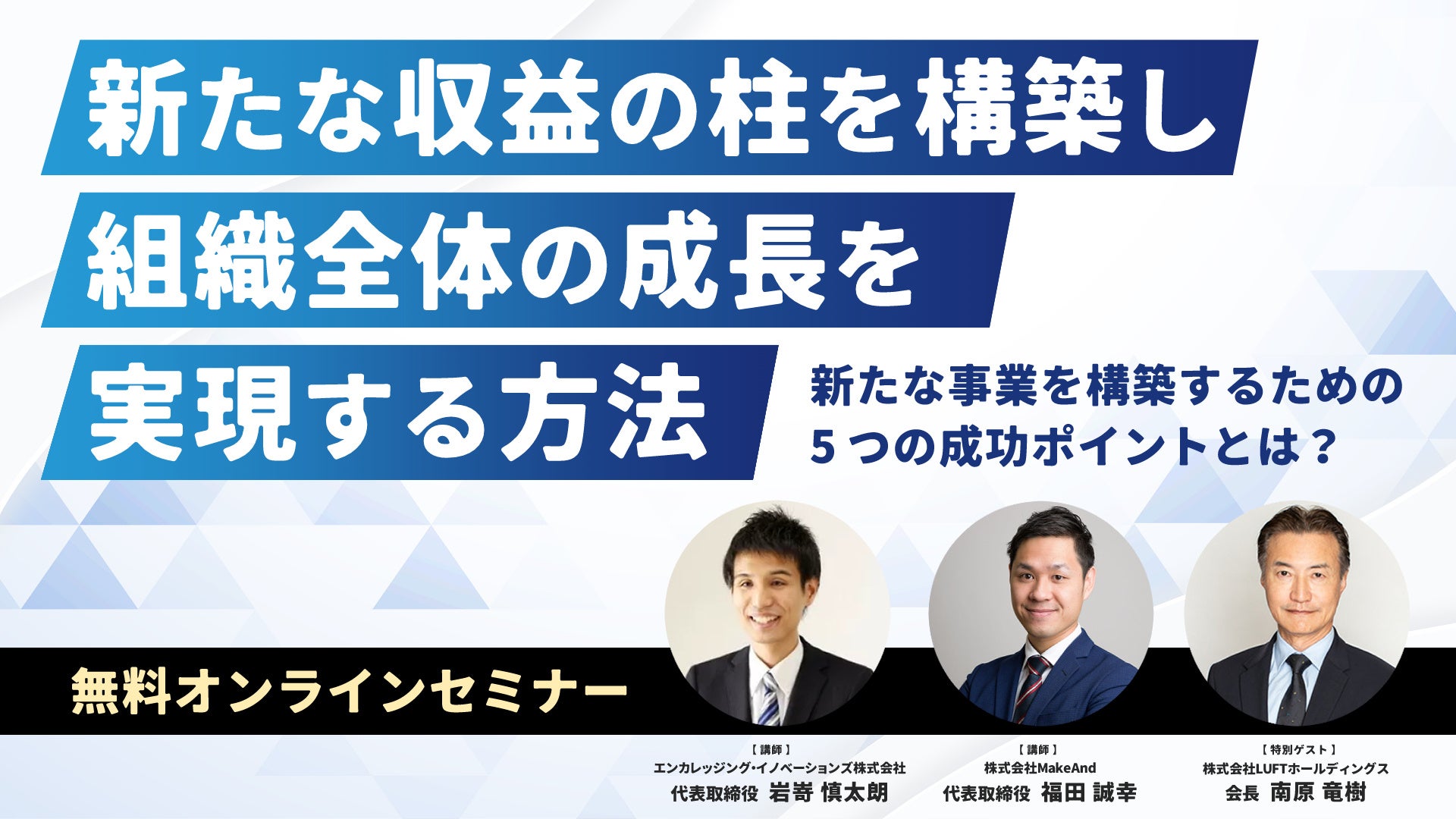 株式会社MakeAndとエンカレッジング・イノベーションズ株式会社は、マネーの虎のレジェンドとしても有名な南原竜樹氏を特別ゲストに迎え、無料オンラインセミナーを開催します。