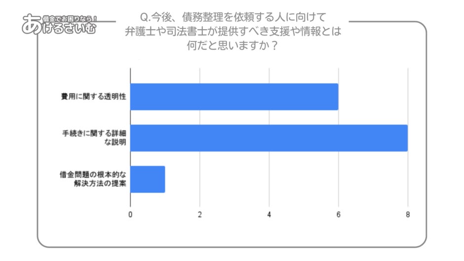 最も多くの回答を集めたのは「手続きに関する詳細な説明」で、8人が重要と考えています。債務整理のプロセスを理解することで、不適切な業者に騙されるリスクを減らすことができると考えられます。