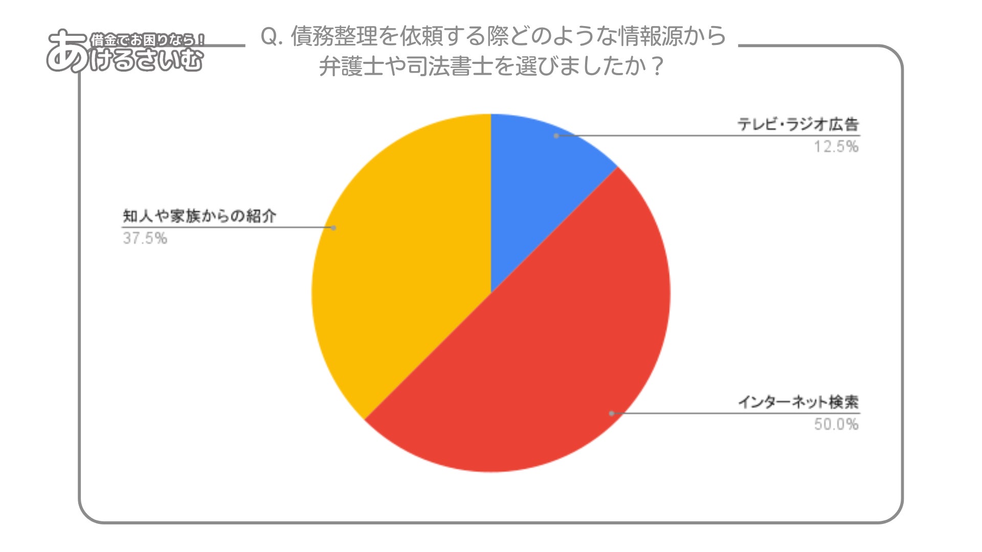 約5割がインターネット検索から債務整理をする法律事務所を決定していることが明らかになりました。続いて、知人や家族からの紹介(37.5%)、テレビ・ラジオ広告(12.5%)という結果に。