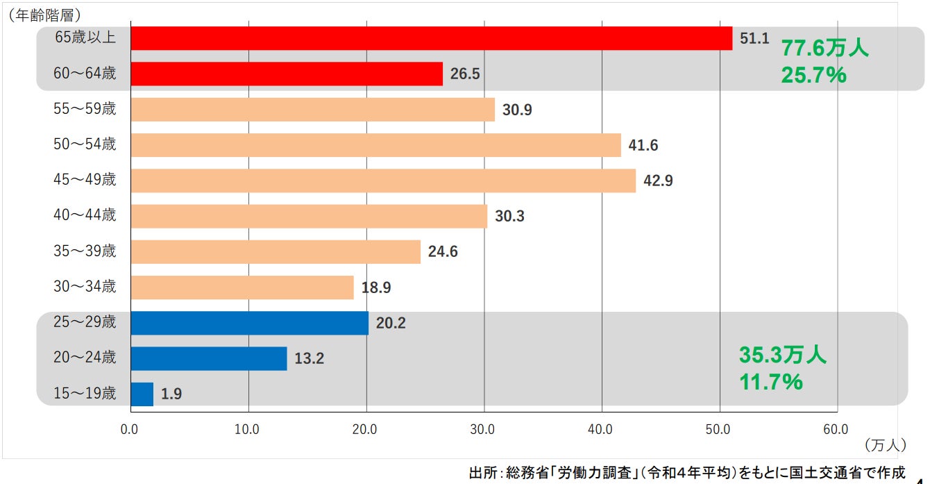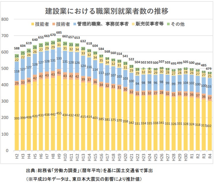 日本の建設業界では、長期的な人手不足が深刻な課題となっています。国土交通省のデータによると、建設業に従事する労働者の数は年々減少しており、特に若年層の新規参入が減少している一方で、高齢化が進んでいます。例えば、2022年(令和4)時点で建設技能者数の27.5%が60歳以上であり、10年後にはその大半が引退することが見込まれます。