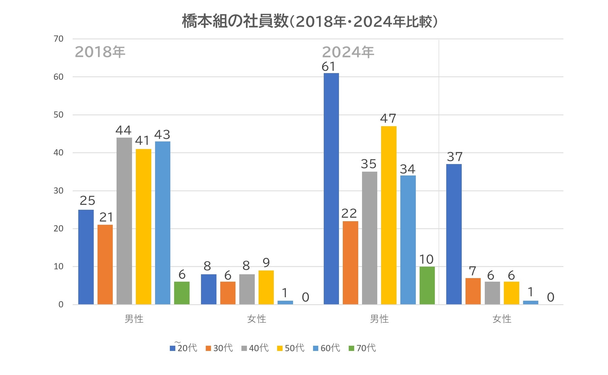 当社では、建設業が抱える人材不足等の問題を解決するため、若手が魅力を感じる職場環境の整備や研修制度の充実を図り、2019年卒学生からの新卒採用を強化しました。その結果、2024年時点で10~20代男性社員は2018年の25人から61人と倍以上に増加し、10~20代女性社員も8人から37人へと大幅に増加しました。また同期間、中途採用も含め毎年30名程度の仲間が増えています。