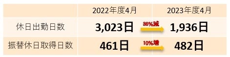 2018年に新設した「技術支援部(当時は工務支援課)」が現場への後方支援を継続した結果、休日出勤は36%減少し、振替休日取得率は10%増加しました。現場は天候に左右されるなど不確定事項が多く、やむなく休日出勤をする場合は振替休日取得を行っています。