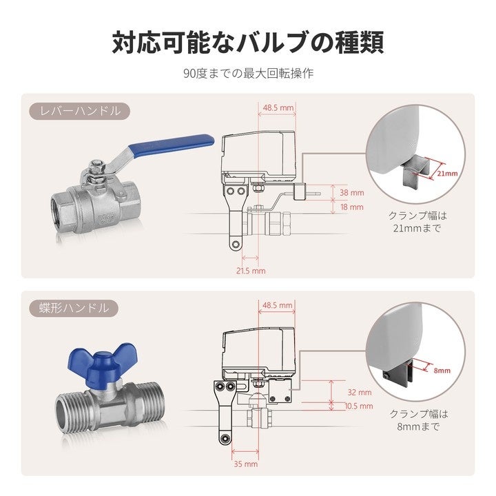 スマートバルブコントローラー T1はレバーと蝶形のハンドルを備え得たバルブに適用可能で、DN15、DN20、DN25(1/2インチ、3/4インチ、1インチ)の配管で効率的な流量調整を実現できます。その柔軟性と互換性により、スマートバルブコントローラー T1はほとんどの家庭の水道システムに幅広く対応できます。
