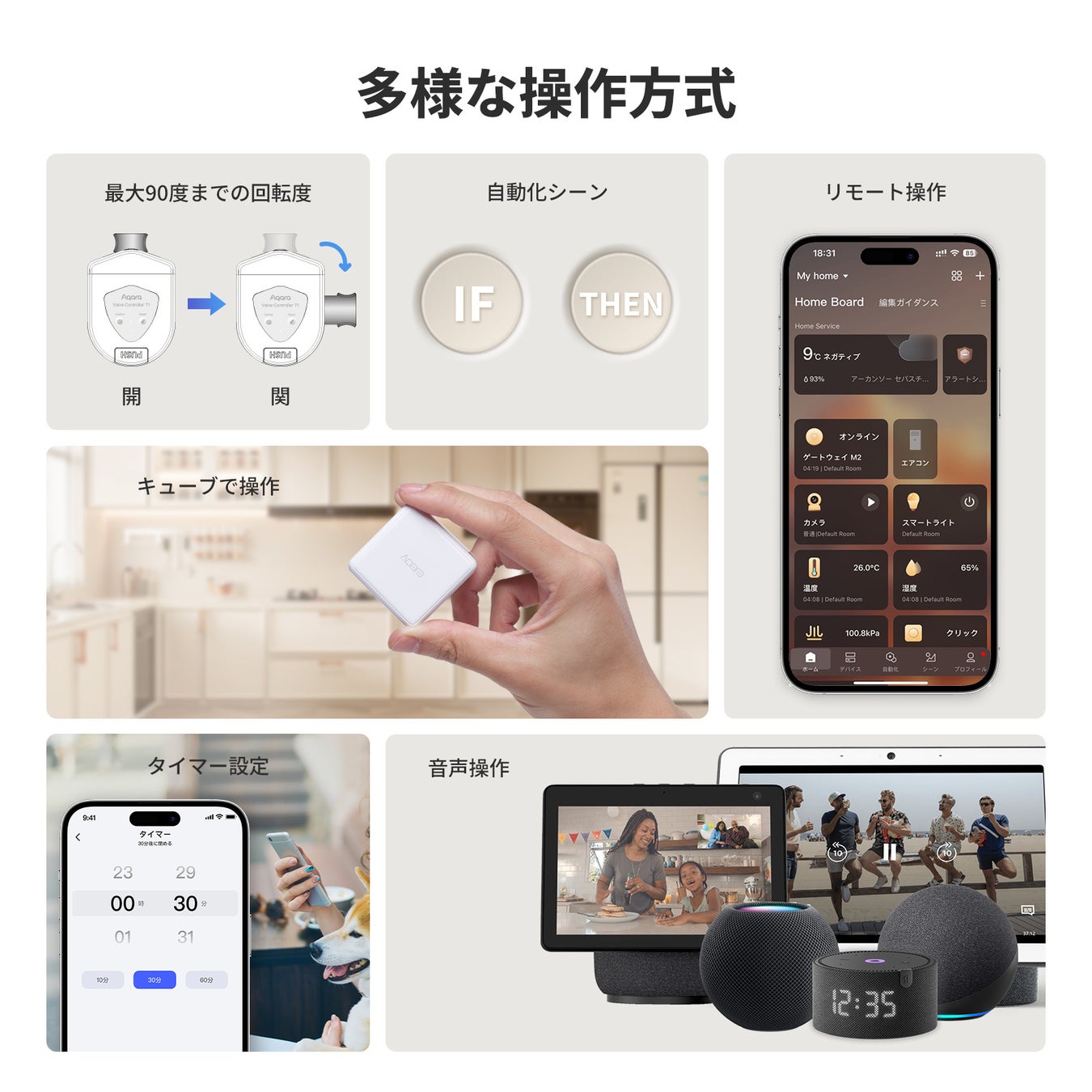スマートバルブコントローラー T1は手動操作、アプリを介したリモート操作、タイマー設定、他製品と連動した自動化など、様々な制御方法が可能で、利用者は各自のニーズにより好きな方法でデバイスを制御することができます。