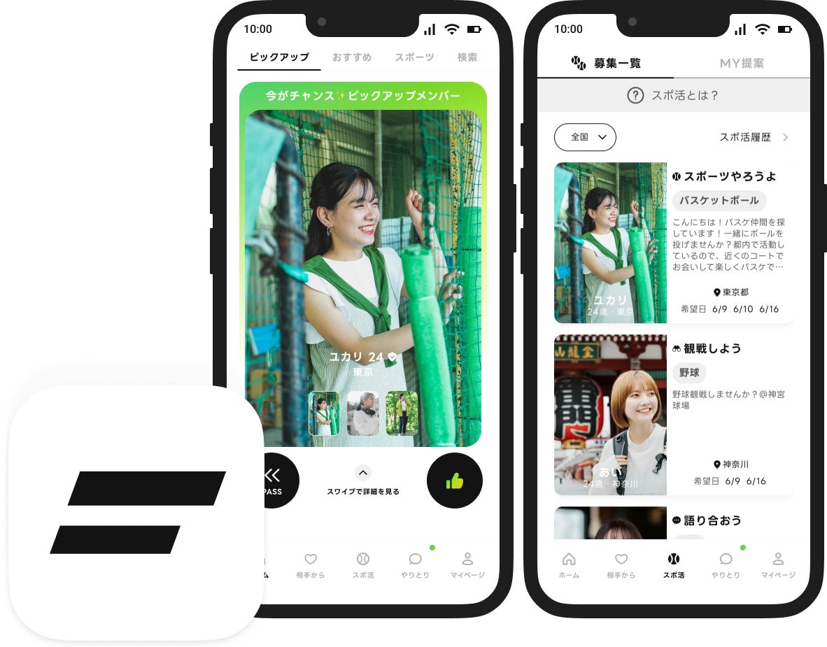 ご自身が好き・得意なスポーツをアピールしやすいプロフィール機能や、気軽にスポーツデートのお誘いができる「スポ活」機能などを中心として、スポーツ好きな皆さまがご自身の魅力をアピールしやすい出会いの場をご用意しております。