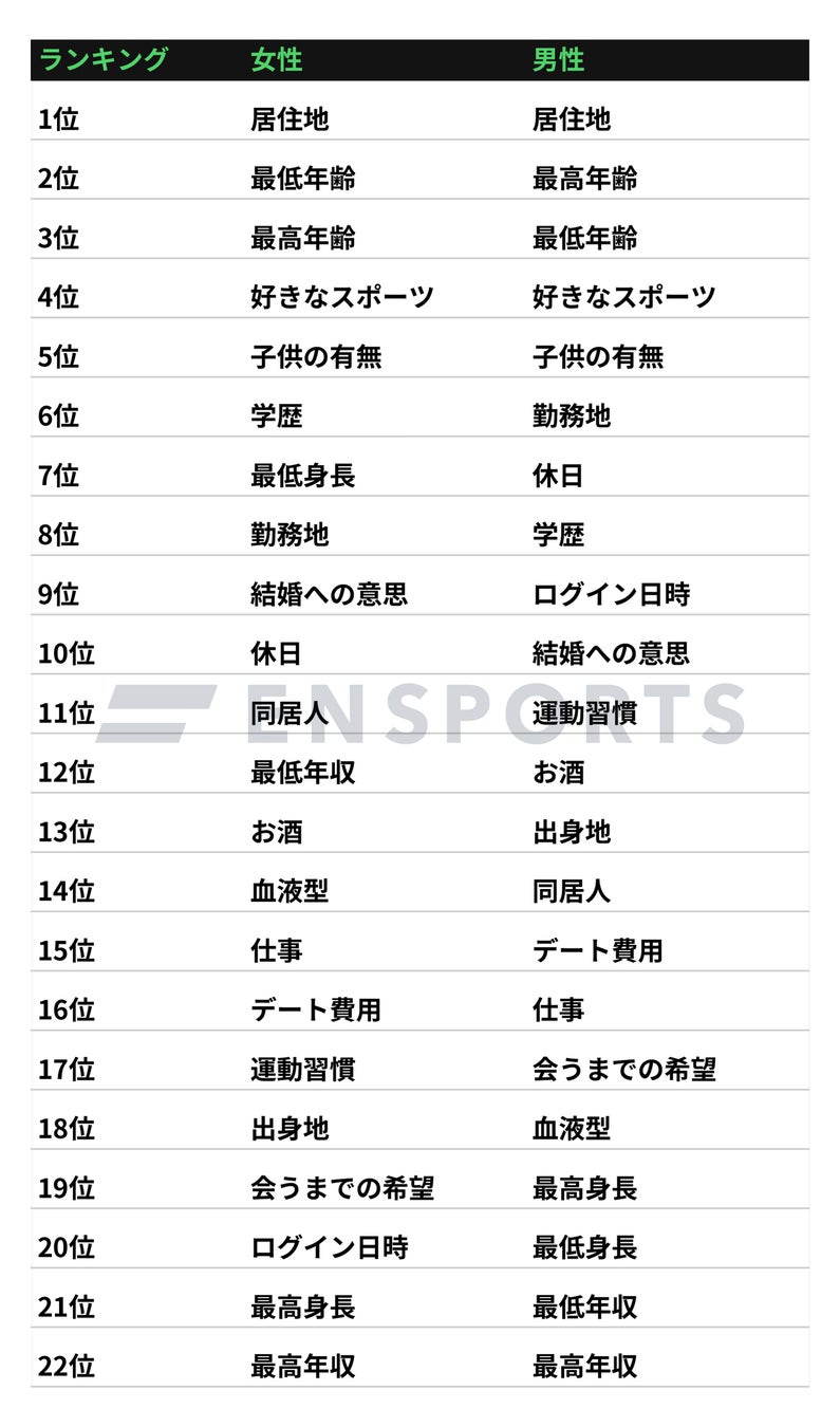 恋活・婚活マッチングアプリENSPORTS(エンスポーツ)における、直近20万回の検索フィルタリング設定から、使用された絞り込み項目の統計を取りました。