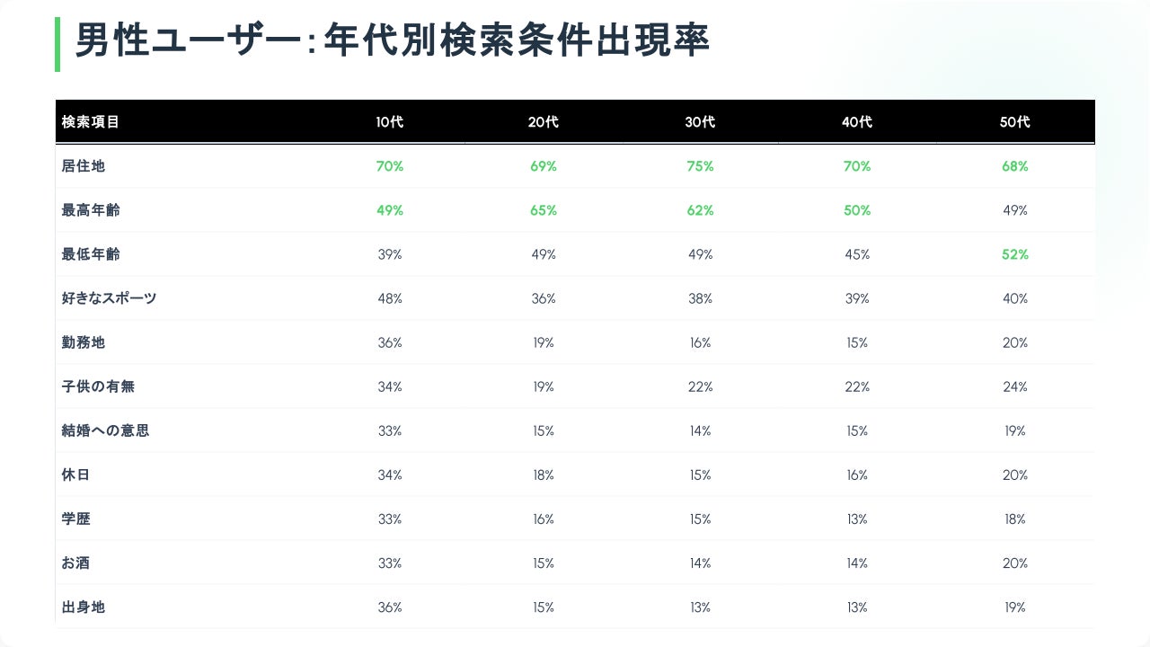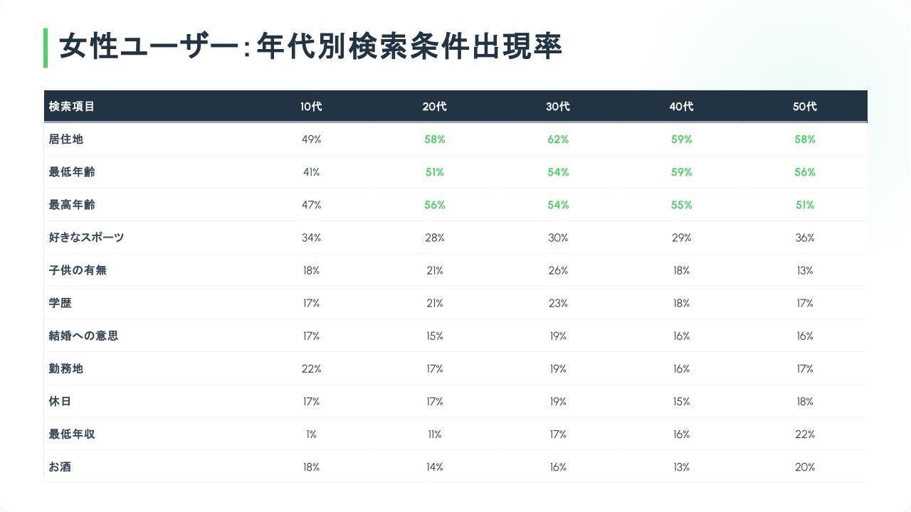 現代の恋愛ユーザーがパートナー選びで重視する要素を紐解き、ユーザー体験の向上へ繋げるために、よく使用される絞り込み項目を分析いたしました。