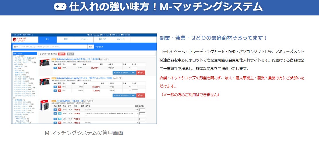 多くの方々が生活費や将来の資産形成を目的に、ゲームやホビー商材の仕入れとしてネット販売を選択するようになり、その中でM-マッチングシステムが注目を集めています。