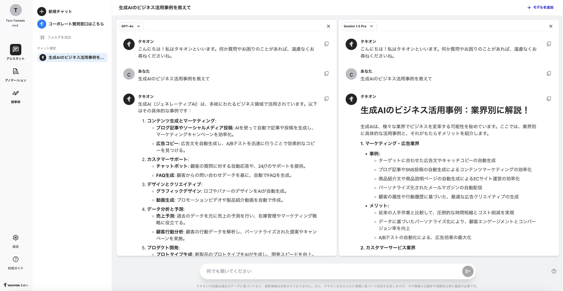 また2024年7月25日に追加された最大4つのAIモデルの出力を同時に比較可能な「モデル比較機能」をご活用いただくことで、各モデルの特徴を理解しながら、効率的に最適な出力結果を取得することができます。